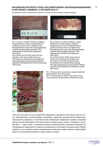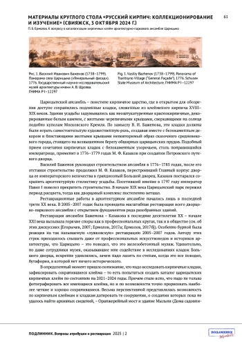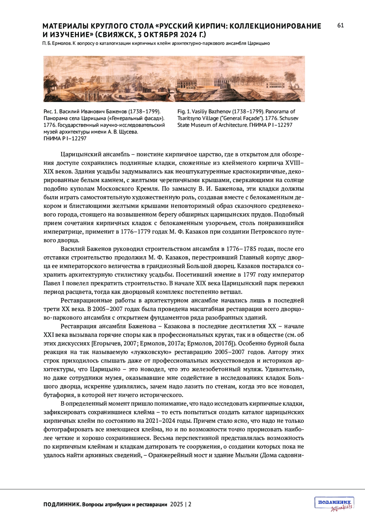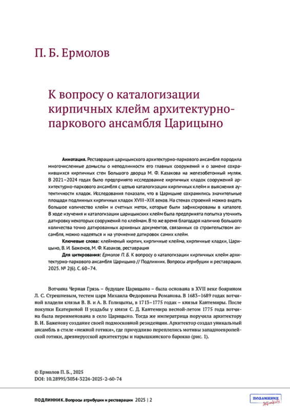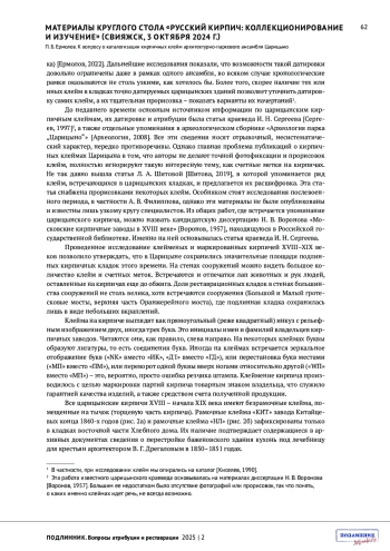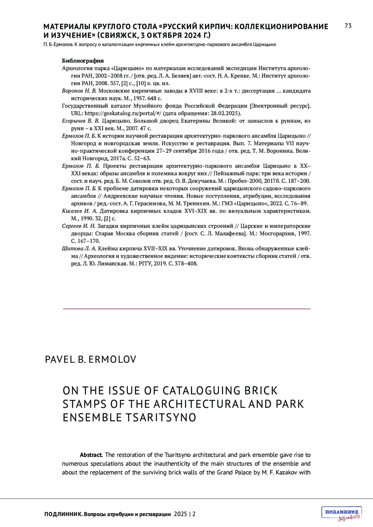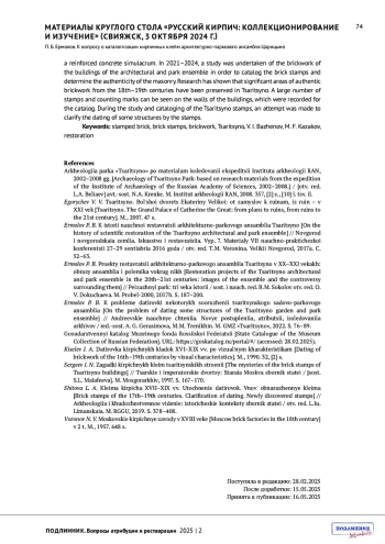Реставрация царицынского архитектурно-паркового ансамбля породила многочисленные домыслы о неподлинности его главных сооружений и о замене сохранившихся кирпичных стен Большого дворца М. Ф. Казакова на железобетонный муляж. В 2021–2024 годах было предпринято исследование кирпичных кладок сооружений архитектурно-паркового ансамбля с целью каталогизации кирпичных клейм и выяснения аутентичности кладок. Исследования показали, что в Царицыне сохранились значительные площади подлинных кирпичных кладок XVIII–XIX веков. На стенах строений можно видеть большое количество клейм и счетных меток, которые были зафиксированы в каталоге. В ходе изучения и каталогизации царицынских клейм была предпринята попытка уточнить датировку некоторых сооружений по клеймам. В то же время благодаря наличию большого количества точно датированных архивных документов, связанных со строительством ансамбля, можно надеяться и на уточнение датировок самих клейм.