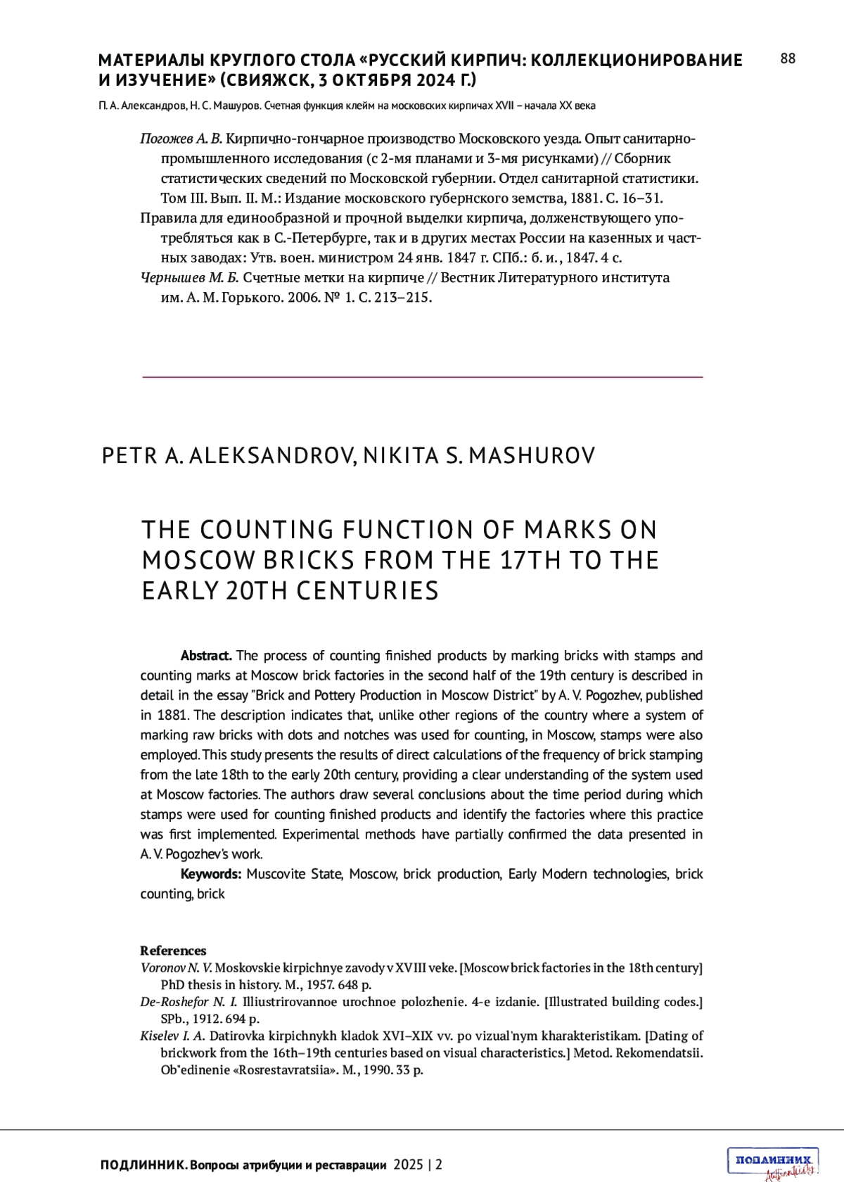 Процесс подсчета готовой продукции путем постановки на кирпичи клейм и счетных меток на московских кирпичных заводах второй половины XIX века подробно описан в очерке «Кирпично-гончарное производство Московского уезда» А. В. Погожева, опубликованном в 1881 году. Из описания следует, что, в отличии от других регионов страны, где для подсчета применялась система постановки знаков в виде точек и резцов на кирпиче-сырце, в Москве применялись в том числе и клейма. В данном исследовании впервые приведены результаты прямых подсчетов периодичности клеймения кирпичей, произведенных с конца XVIII до начала XX века, что дает четкое представление о системе, действовавшей на московских заводах. Авторами сделаны выводы о временном интервале использования клейм для подсчета готовой продукции, и заводах, на которых данная практика была применена впервые. Экспериментальным способом частично подтверждены данные, приведенные в работе А. В. Погожева.