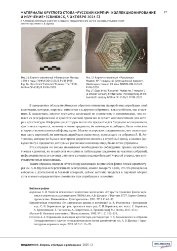 Государственный научно-исследовательский музей архитектуры имени А. В. Щусева (далее – Музей архитектуры им. А. В. Щусева), которому в 2024 году исполнилось 90 лет, является крупнейшим в стране собранием предметов архитектурной тематики, общее количество которых приближается к 840 тысячам. Среди них относительно небольшую, но важную часть составляет коллекция керамики и строительных материалов. Она состоит из изразцов, строительных растворов, а также около тысячи кирпичей самого разного времени от XI века до настоящего времени.