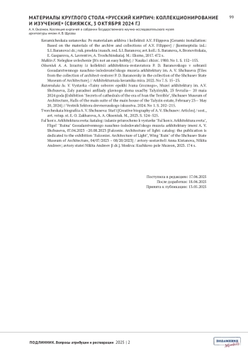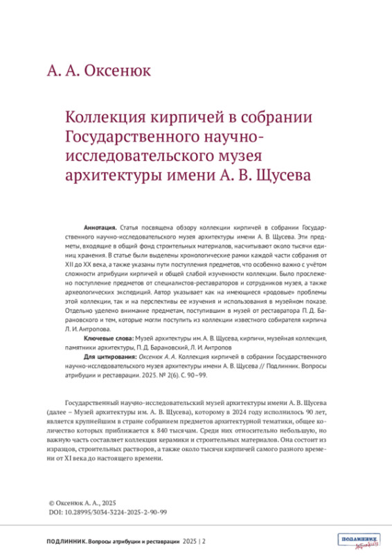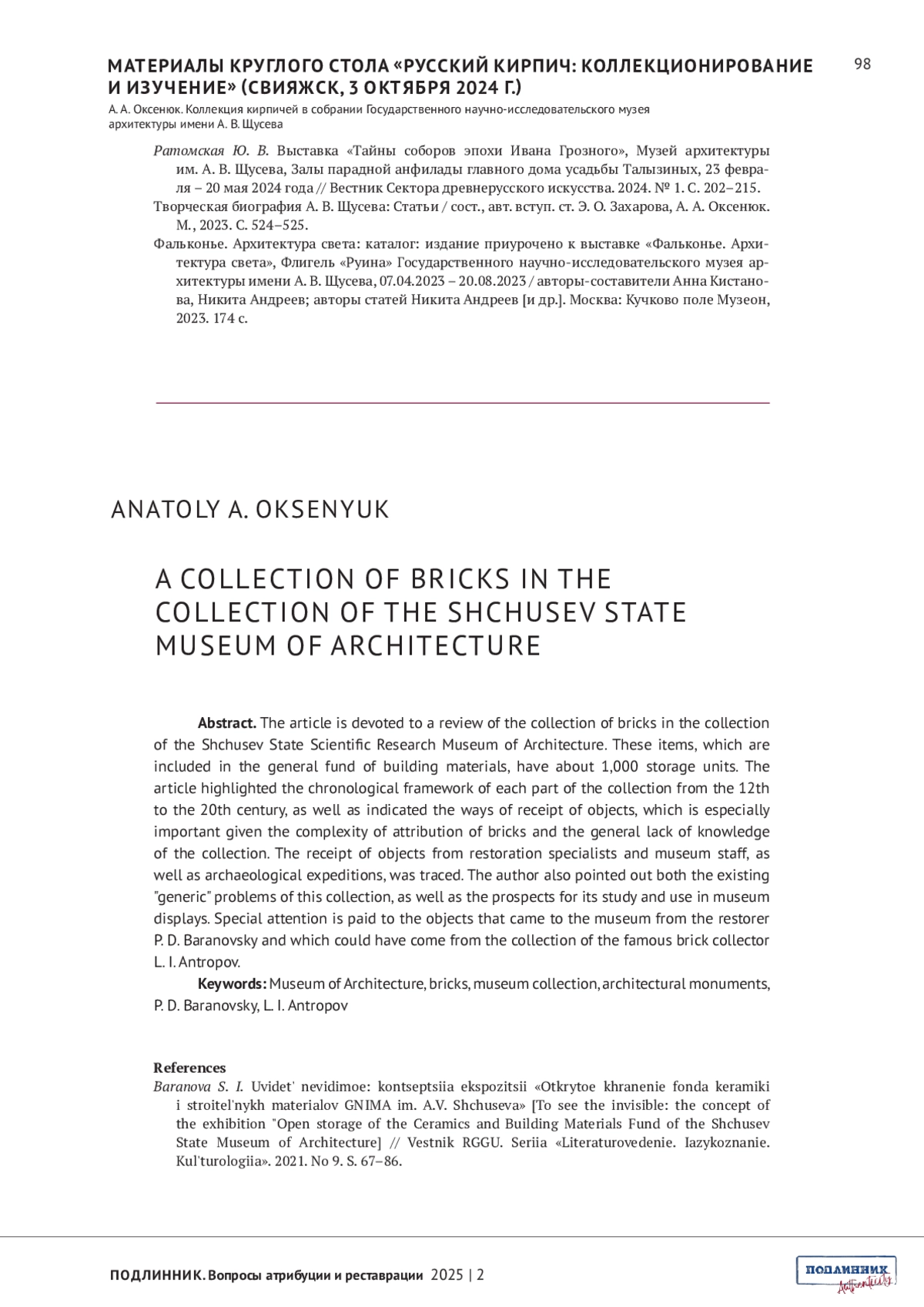 Статья посвящена обзору коллекции кирпичей в собрании Государственного научно-исследовательского музея архитектуры имени А. В. Щусева. Эти предметы, входящие в общий фонд строительных материалов, насчитывают около тысячи единиц хранения. В статье были выделены хронологические рамки каждой части собрания от XII до XX века, а также указаны пути поступления предметов, что особенно важно с учётом сложности атрибуции кирпичей и общей слабой изученности коллекции. Было прослежено поступление предметов от специалистов-реставраторов и сотрудников музея, а также археологических экспедиций. Автор указывает как на имеющиеся «родовые» проблемы этой коллекции, так и на перспективы ее изучения и использования в музейном показе. Отдельно уделено внимание предметам, поступившим в музей от реставратора П. Д. Барановского и тем, которые могли поступить из коллекции известного собирателя кирпича Л. И. Антропова.