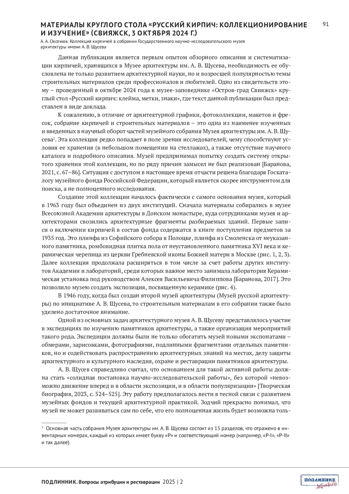 4. Оксенюк А. А. Изразцы из коллекции архитектора-реставратора П. Д. Барановского в собрании Государственного научно-исследовательского музея архитектуры им. А. В. Щусева // Архитектурная керамика мира. 2022. № 7. С. 15-23.