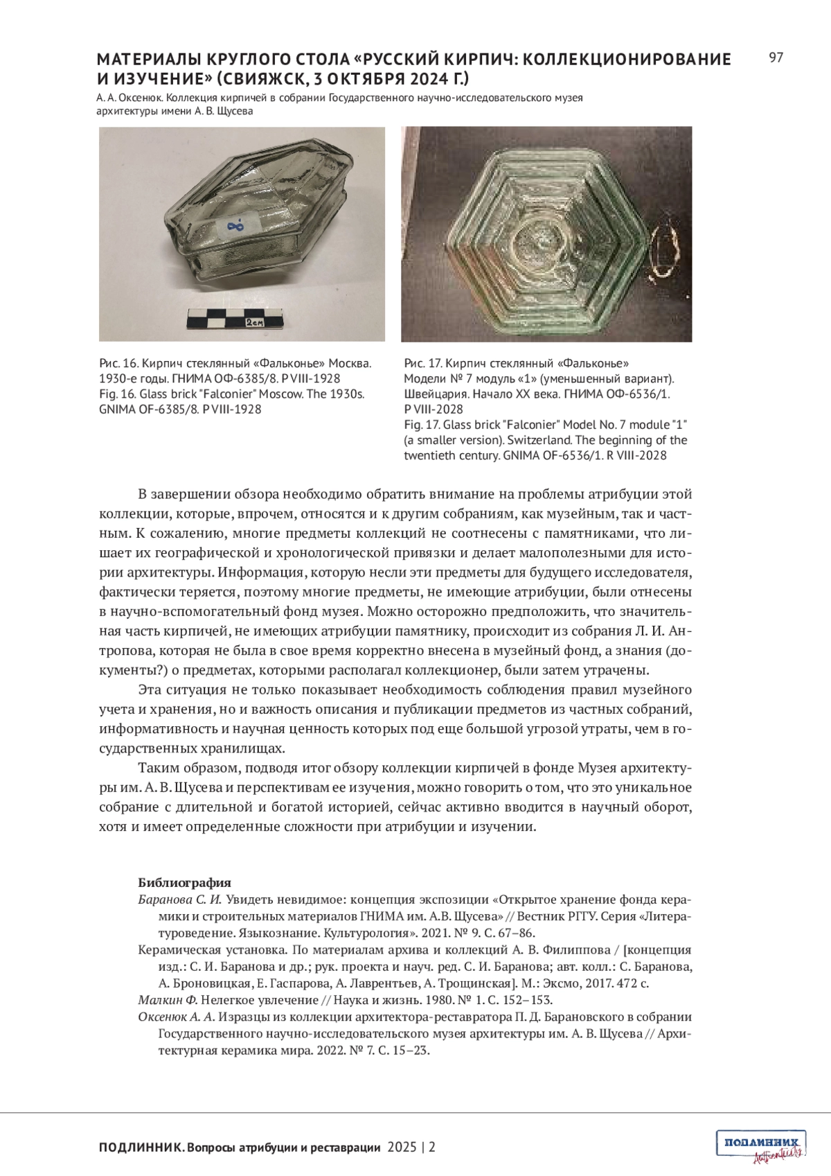 1. Баранова С. И. Увидеть невидимое: концепция экспозиции “Открытое хранение фонда керамики и строительных материалов ГНИМА им. А. В. Щусева” // Вестник РГГУ. Серия “Литературоведение. Языкознание. Культурология”. 2021. № 9. С. 67-86.