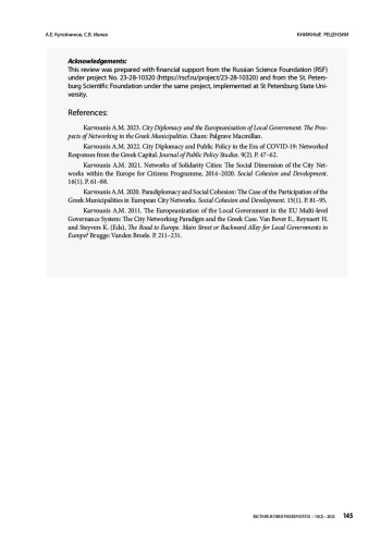 4. Karvounis A. M. 2020. Paradiplomacy and Social Cohesion: The Case of the Participation of the Greek Municipalities in European City Networks. Social Cohesion and Development, Volume 15, No. 1, pp. 81-95.