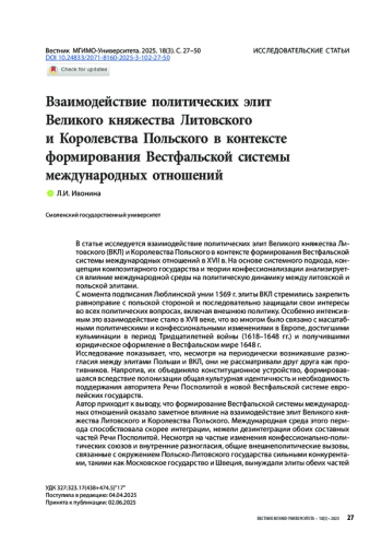 В статье исследуется взаимодействие политических элит Великого княжества Литовского (ВКЛ) и Королевства Польского в контексте формирования Вестфальской системы международных отношений в XVII веке. На основе системного подхода, концепции композитарного государства и теории конфессионализации анализируется влияние международной среды на политическую динамику между литовской и польской элитами. С момента подписания Люблинской унии 1569 г. элиты ВКЛ стремились закрепить равноправие с польской стороной и последовательно защищали свои интересы во всех политических вопросах, включая внешнюю политику. Особенно интенсивным это взаимодействие стало в XVII веке, что во многом было связано с масштабными политическими и конфессиональными изменениями в Европе, достигшими кульминации в период Тридцатилетней войны (1618–1648 гг.) и получившими юридическое оформление в Вестфальском мире 1648 года. Исследование показывает, что, несмотря на периодически возникавшие разногласия между элитами Польши и ВКЛ, они не рассматривали друг друга как противников. Напротив, их объединяло конституционное устройство, формировавшаяся вследствие полонизации общая культурная идентичность и необходимость поддержания авторитета Речи Посполитой в новой Вестфальской системе европейских государств. Автор приходит к выводу, что формирование Вестфальской системы международных отношений оказало заметное влияние на взаимодействие элит Великого княжества Литовского и Королевства Польского. Международная среда этого периода способствовала скорее интеграции, нежели дезинтеграции обоих составных частей Речи Посполитой. Несмотря на частые изменения конфессионально-политических союзов и внутренние разногласия, общие внешнеполитические вызовы, связанные с окружением Польско-Литовского государства сильными конкурентами, такими как Московское государство и Швеция, вынуждали элиты обеих частей стремиться к согласованию интересов и укреплению единства. Таким образом, международные процессы середины XVII века выступали в качестве важного внешнего фактора, определявшего характер политического взаимодействия польской и литовской элит и способствовавшего усилению внутренней консолидации Речи Посполитой в новых реалиях Вестфальского порядка.
