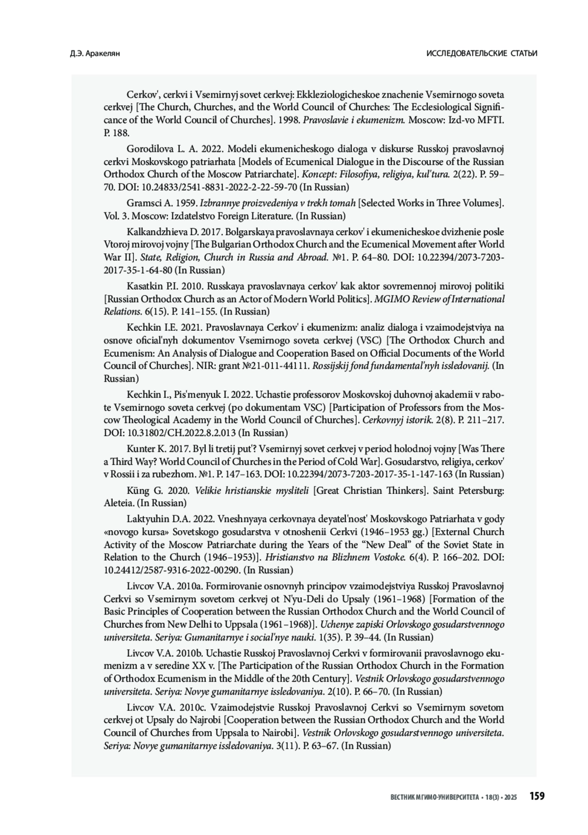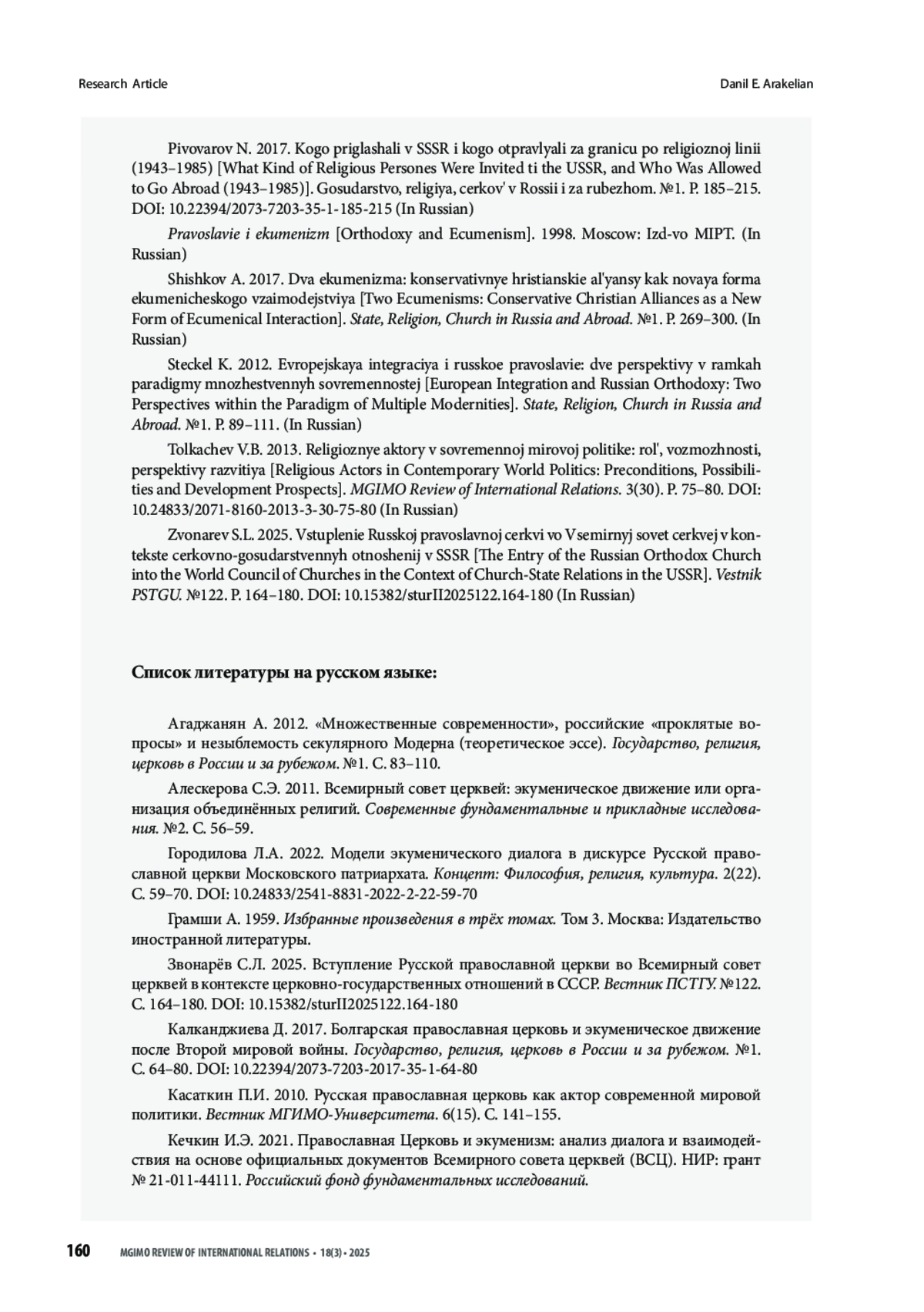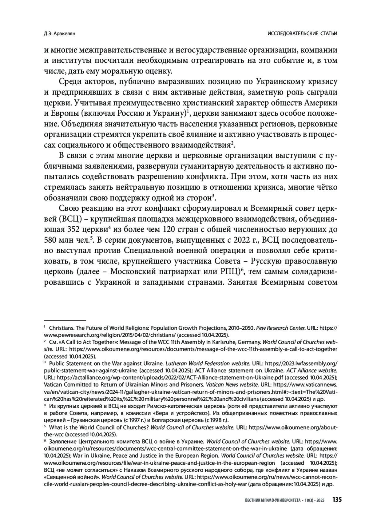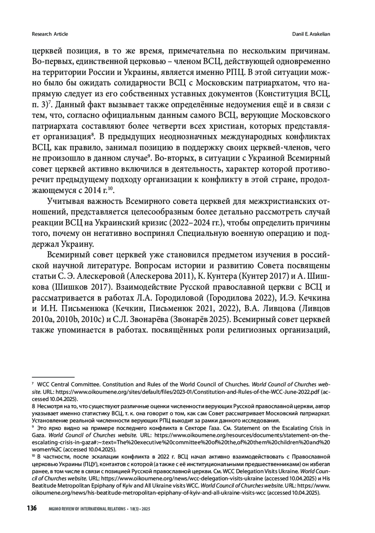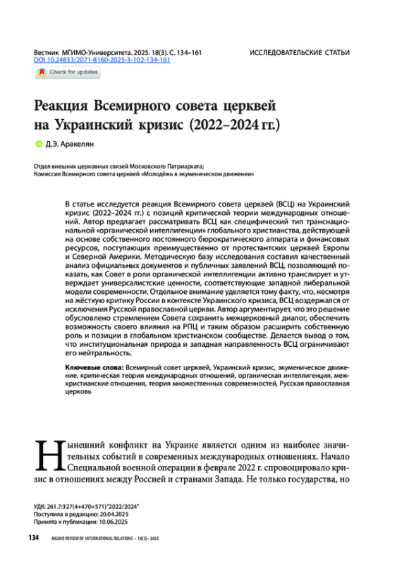 АРАКЕЛЯН Д. Э. РЕАКЦИЯ ВСЕМИРНОГО СОВЕТА ЦЕРКВЕЙ НА УКРАИНСКИЙ КРИЗИС (2022–2024 ГГ.) // ВЕСТНИК МГИМО-УНИВЕРСИТЕТА. 2025. ТОМ 18, № 3