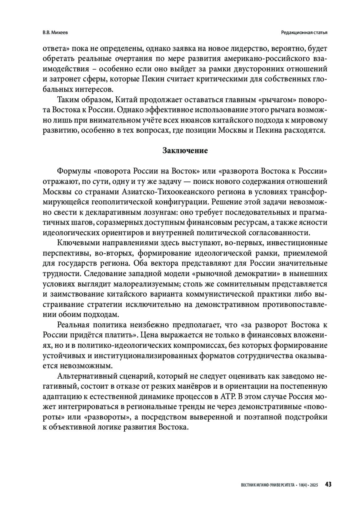 Статья посвящена переосмыслению концепции «поворота России на Восток» через постановку более широкого исследовательского вопроса — каким образом возможно инициировать «поворот Востока к России». Теоретическая основа анализа восходит к научному наследию академика А. В. Торкунова и акцентирует внимание на институциональных и идейных условиях реализации российской политики в Азиатско-Тихоокеанском регионе (АТР). Автор выделяет четыре группы факторов, определяющих перспективы этой стратегии: (1) характер региональной стабильности и нестабильности; (2) степень дружественности или недружественности стран региона; (3) особенности экономической динамики АТР, во многом зависящей от состояния китайско-американских отношений и внутренних приоритетов КНР; (4) идейно-ценностные рамки, показывающие ограниченность антиамериканизма и многополярности в качестве универсальных стратегических оснований. Центральное место в анализе занимает «фактор Китая», рассмотренный на основе поквартальной динамики 2022–2025 гг., что позволяет выявить постепенный переход позиции Пекина от доброжелательного нейтралитета к более прагматичной и осторожной линии поведения. Рассматриваются попытки Китая утвердиться в роли посредника в украинском конфликте, пределы концепции «партнёрства без границ», уроки, которые Пекин извлекает из украинского опыта для своей политики в отношении Тайваня. Экономическое измерение двусторонних связей характеризуется не столько стратегическим разворотом, сколько адаптацией и замещением, обусловленными санкционными ограничениями. Делается вывод о том, что при всей сохраняющейся стратегической значимости России для Китая расширение «полей расхождений» формирует новые риски для согласования интересов. Устойчивость «поворота Востока к России» возможна лишь при опоре на постепенную институционализацию сотрудничества, включение в региональные процессы и отказ от излишней идеологизации внешнеполитического курса.