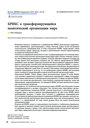 Гипотеза исследования заключается в том, что формирующаяся по сетевому принципу новая политическая организация мира будет иметь более сложную структуру, чем конфигурация мирового порядка, которую образуют ведущие государства в виде одного или нескольких полюсов, как это обычно представляется. БРИКС развивает свою сетевую структуру. В результате происходящих изменений наблюдается структурное соответствие организационного принципа БРИКС и структурой политической организации мира. Исследовательский вопрос формулируется следующим образом: существует ли соответствие между этими двумя организационными структурами и, если да, то что необходимо сделать БРИКС для усиления своих позиций в складывающейся новой политической организации мира.