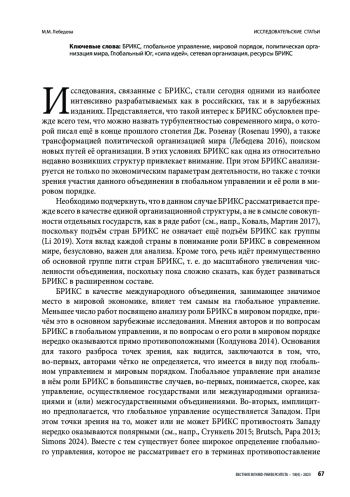 Внимание научного сообщества к проблематике БРИКС обусловлено кардинальными переменами, происходящими в мире, поиском новых путей построения политического взаимодействия. В этом отношении БРИКС представляет собой относительно новую структуру, которая в значительной степени ориентирована на развитие Глобального Юга.