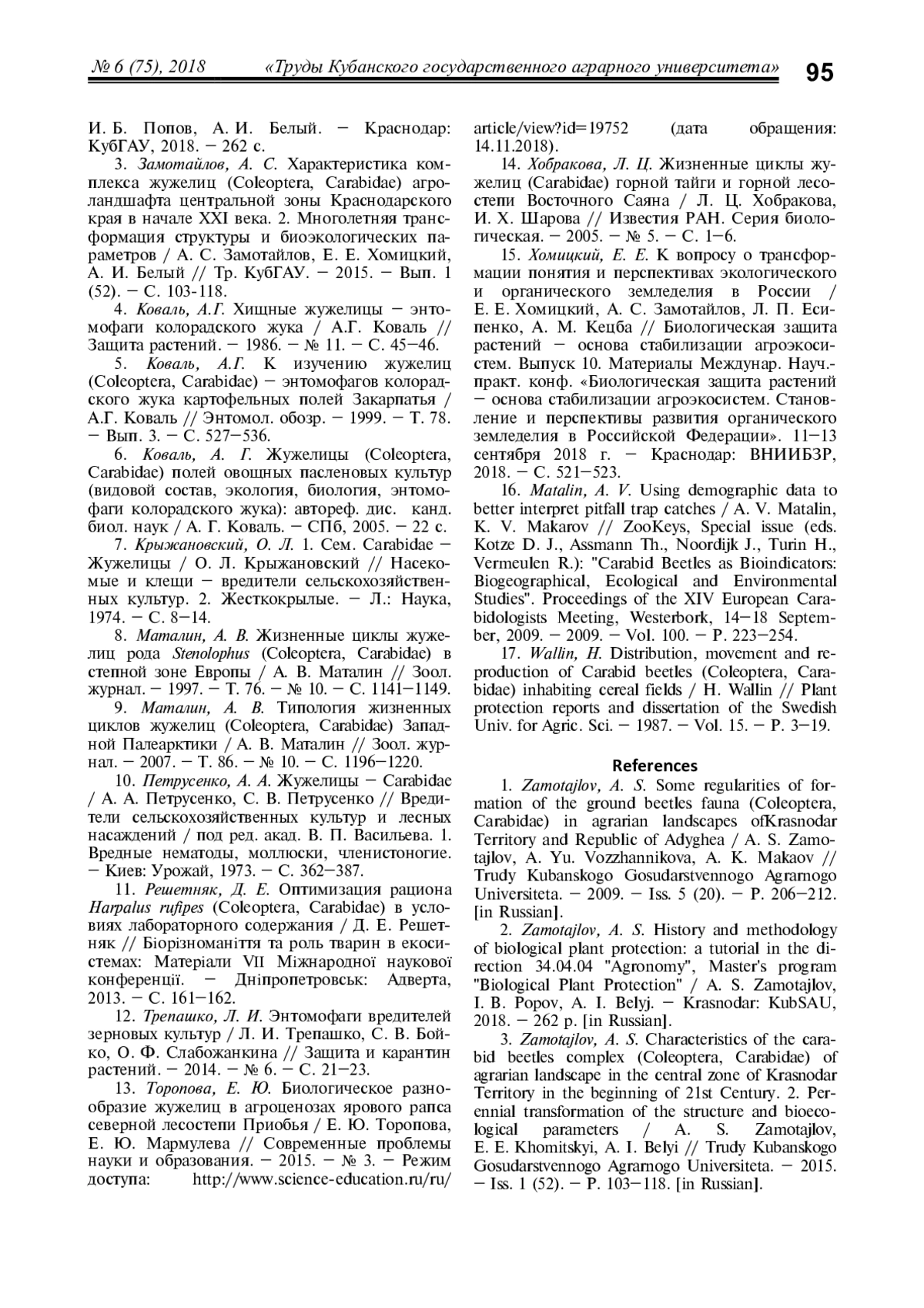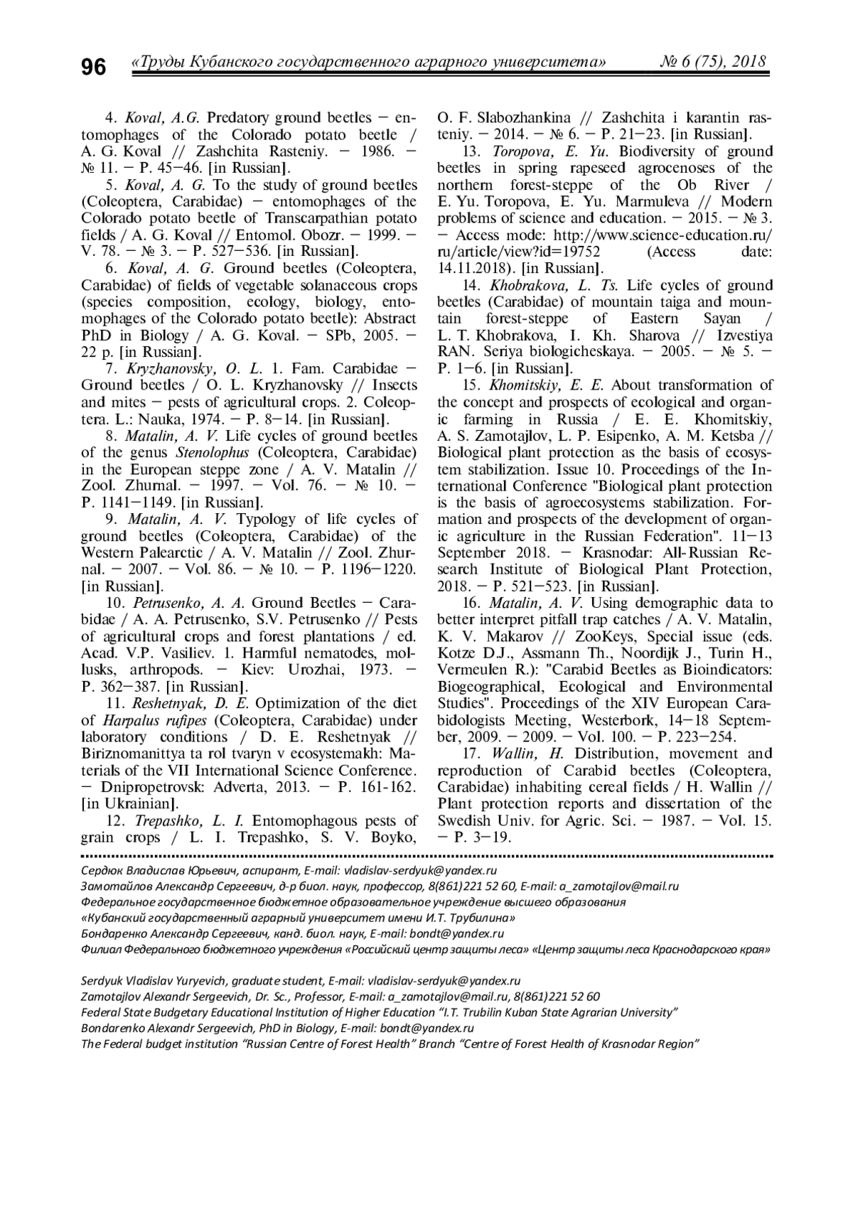СЕРДЮК В. Ю., ЗАМОТАЙЛОВ А. С., БОНДАРЕНКО А. С. АГРОБИОЛОГИЧЕСКИЕ ОСОБЕННОСТИ И ХОЗЯЙСТВЕННОЕ ЗНАЧЕНИЕ НЕКОТОРЫХ ВИДОВ ПОЛЕВЫХ ЖУЖЕЛИЦ (COLEOPTERA, CARABIDAE) В АГРОЦЕНОЗАХ КРАСНОДАРСКОГО КРАЯ