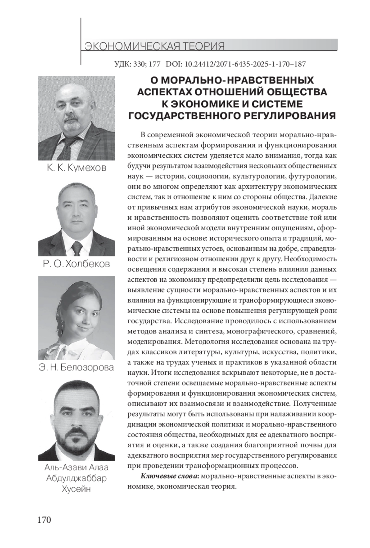 КУМЕХОВ К. К., ХОЛБЕКОВ Р.О., БЕЛОЗОРОВА Э. Н., АЛЬ-АЗЗАВИ А. А. О МОРАЛЬНО-НРАВСТВЕННЫХ АСПЕКТАХ ОТНОШЕНИЙ ОБЩЕСТВА К ЭКОНОМИКЕ И СИСТЕМЕ ГОСУДАРСТВЕННОГО РЕГУЛИРОВАНИЯ // ЭТАП: ЭКОНОМИЧЕСКАЯ ТЕОРИЯ, АНАЛИЗ, ПРАКТИКА. 2025. № 1