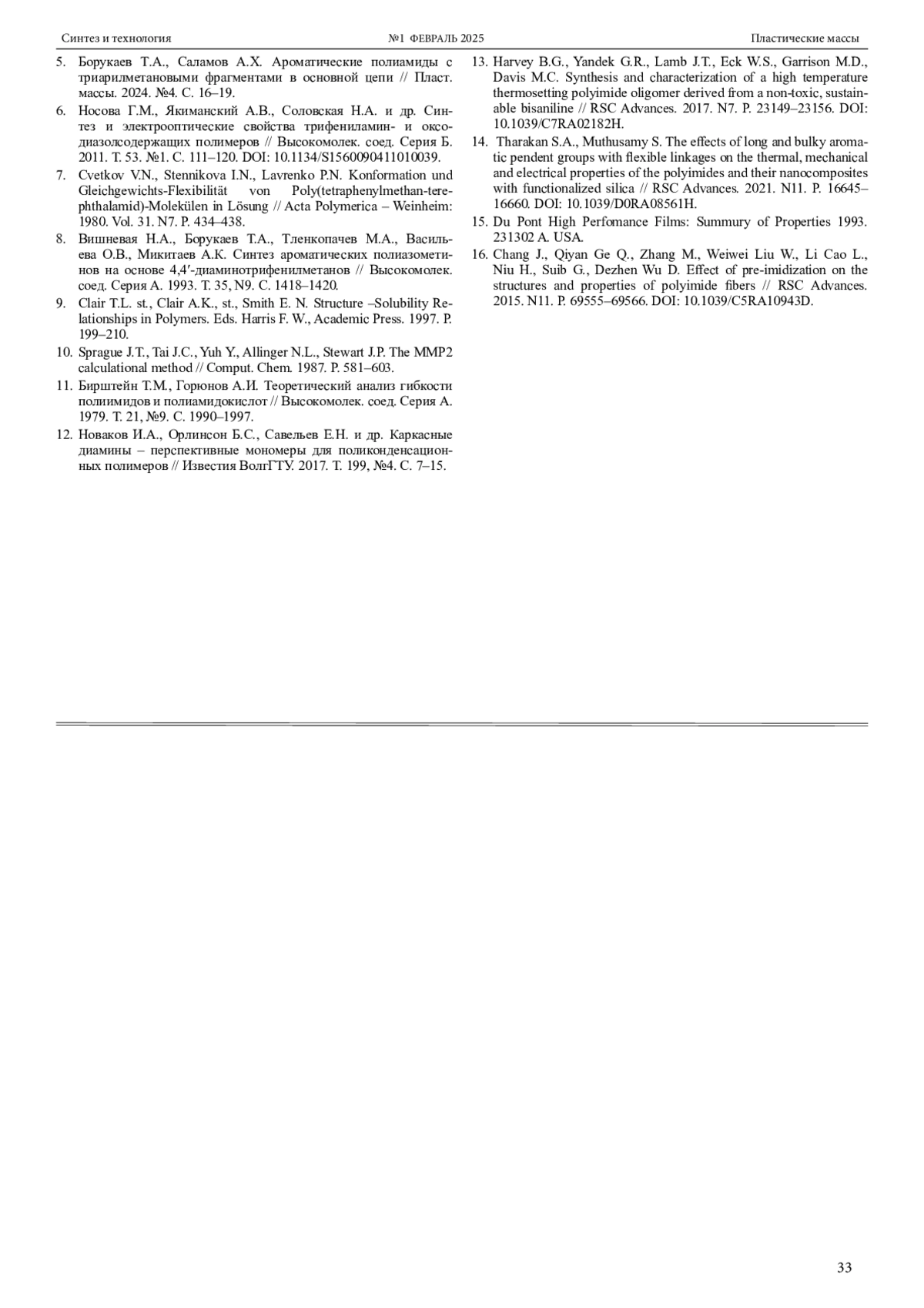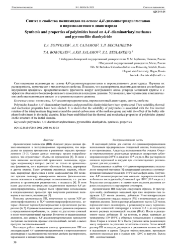 БОРУКАЕВ Т. А., САЛАМОВ А. Х., БЕСЛАНЕЕВА З. Л. СИНТЕЗ И СВОЙСТВА ПОЛИИМИДОВ НА ОСНОВЕ 4,4'-ДИАМИНОТРИАРИЛМЕТАНОВ И ПИРОМЕЛЛИТОВОГО ДИАНГИДРИДА // ПЛАСТИЧЕСКИЕ МАССЫ. 2025. № 1