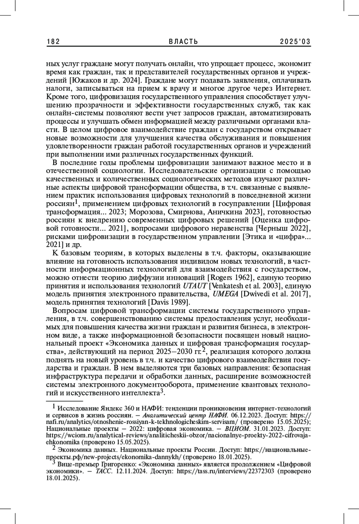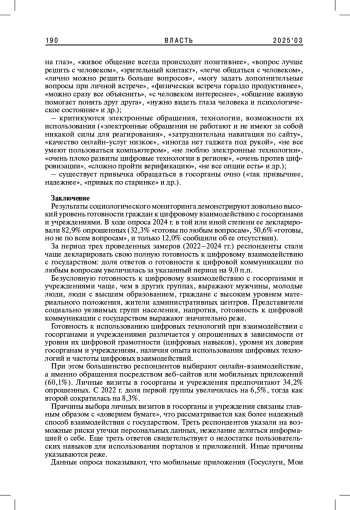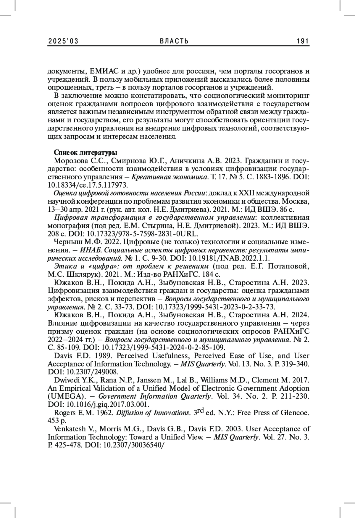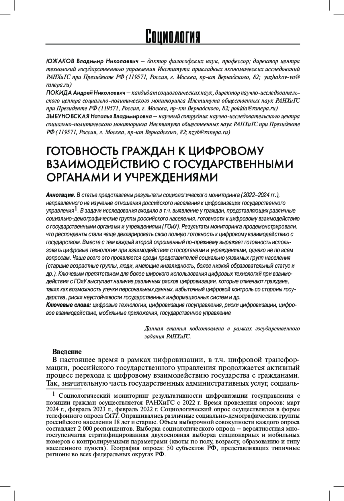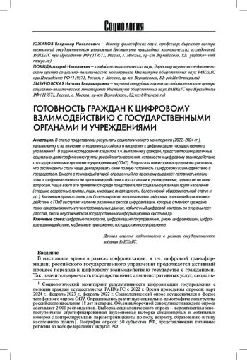 6. Южаков В.Н., Покида А.Н., Зыбуновская Н.В., Старостина А.Н. 2023. Цифровизация взаимодействия граждан и государства: оценка гражданами эффектов, рисков и перспектив. - Вопросы государственного и муниципального управления. № 2. C. 33-73. DOI: 10.17323/1999-5431-2023-0-2-33-73 EDN: BRJMAM