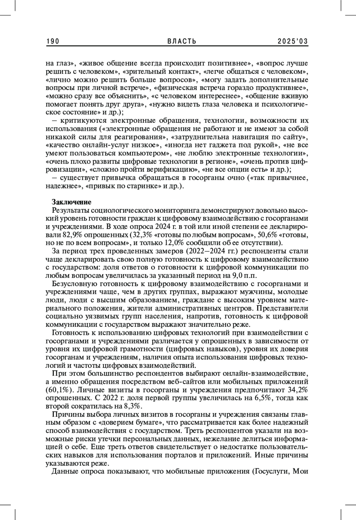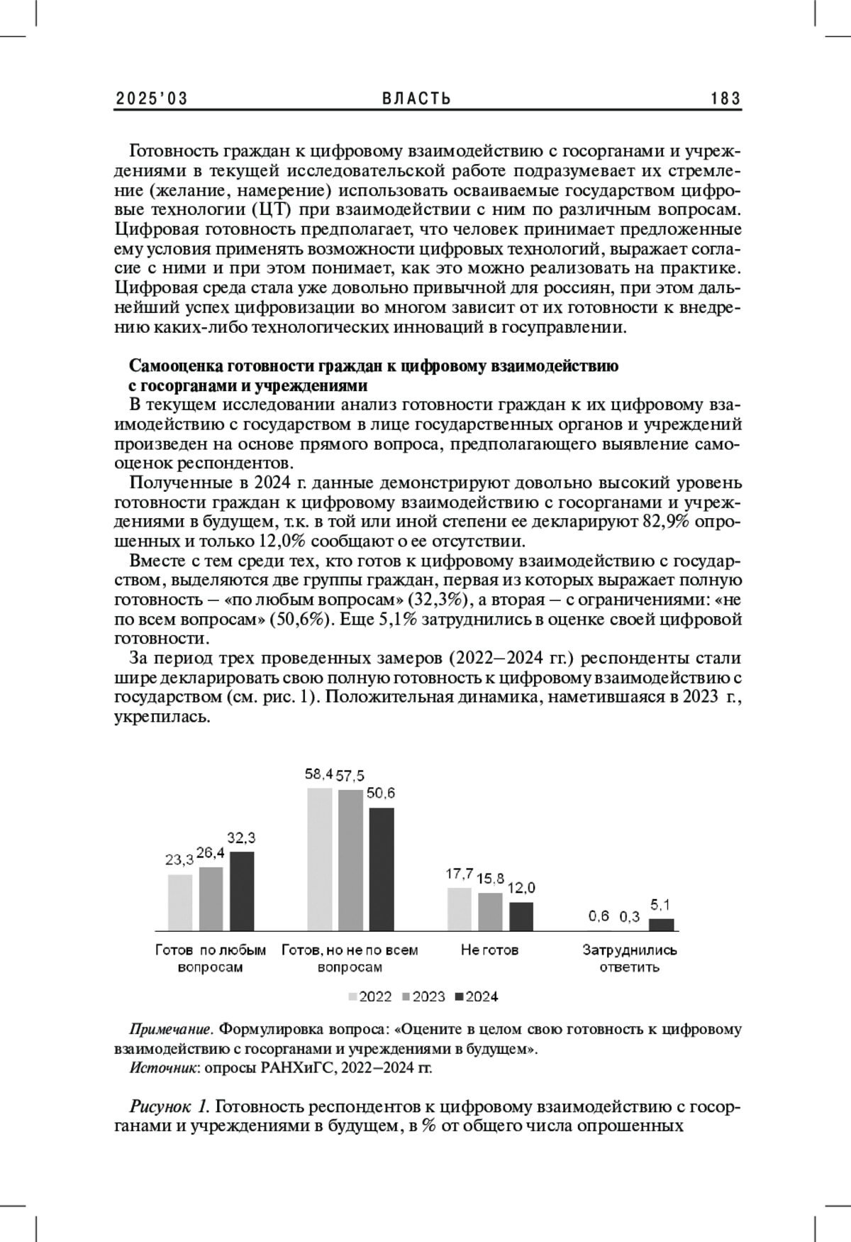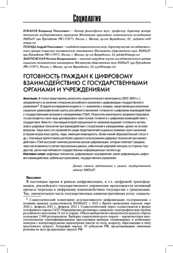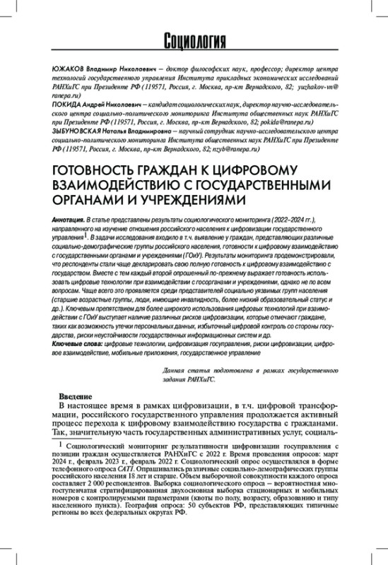 В статье представлены результаты социологического мониторинга (2022-2024 гг.), направленного на изучение отношения российского населения к цифровизации государственного управления. В задачи исследования входило в т. ч. выявление у граждан, представляющих различные социально-демографические группы российского населения, готовности к цифровому взаимодействию с государственными органами и учреждениями (ГОиУ). Результаты мониторинга продемонстрировали, что респонденты стали чаще декларировать свою полную готовность к цифровому взаимодействию с государством. Вместе с тем каждый второй опрошенный по-прежнему выражает готовность использовать цифровые технологии при взаимодействии с госорганами и учреждениями, однако не по всем вопросам. Чаще всего это проявляется среди представителей социально уязвимых групп населения (старшие возрастные группы, люди, имеющие инвалидность, более низкий образовательный статус и др.). Ключевым препятствием для более широкого использования цифровых технологий при взаимодействии с ГОиУ выступает наличие различных рисков цифровизации, которые отмечают граждане, таких как возможность утечки персональных данных, избыточный цифровой контроль со стороны государства, риски неустойчивости государственных информационных систем и др.