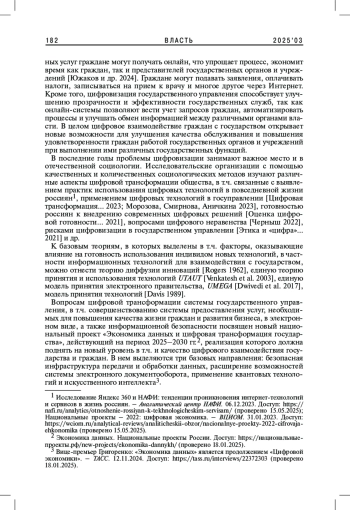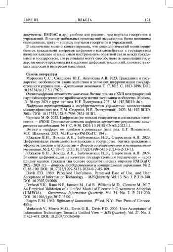 7. Южаков В.Н., Покида А.Н., Зыбуновская Н.В., Старостина А.Н. 2024. Влияние цифровизации на качество государственного управления - через призму оценок граждан (на основе социологических опросов РАНХиГС 2022-2024 гг.) - Вопросы государственного и муниципального управления. № 2. C. 85-109. DOI: 10.17323/1999-5431-2024-0-2-85-109 EDN: DPFSNQ