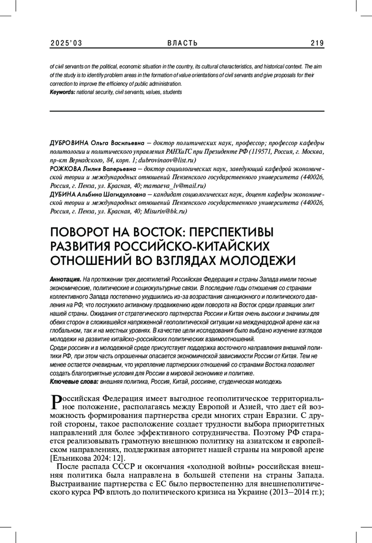 На протяжении трех десятилетий Российская Федерация и страны Запада имели тесные экономические, политические и социокультурные связи. В последние годы отношения со странами коллективного Запада постепенно ухудшились из-за возрастания санкционного и политического давления на РФ, что послужило активному продвижению идеи поворота на Восток среди правящих элит нашей страны. Ожидания от стратегического партнерства России и Китая очень высоки и значимы для обеих сторон в сложившейся напряженной геополитической ситуации на международной арене как на глобальном, так и на местных уровнях. В качестве цели исследования было выбрано изучение взглядов молодежи на развитие китайско-российских политических взаимоотношений. Среди россиян и в молодежной среде присутствует поддержка восточного направления внешней политики РФ, при этом часть опрошенных опасается экономической зависимости России от Китая. Тем не менее остается очевидным, что укрепление партнерских отношений со странами Востока позволяет создать благоприятные условия для России в мировой экономике и политике.