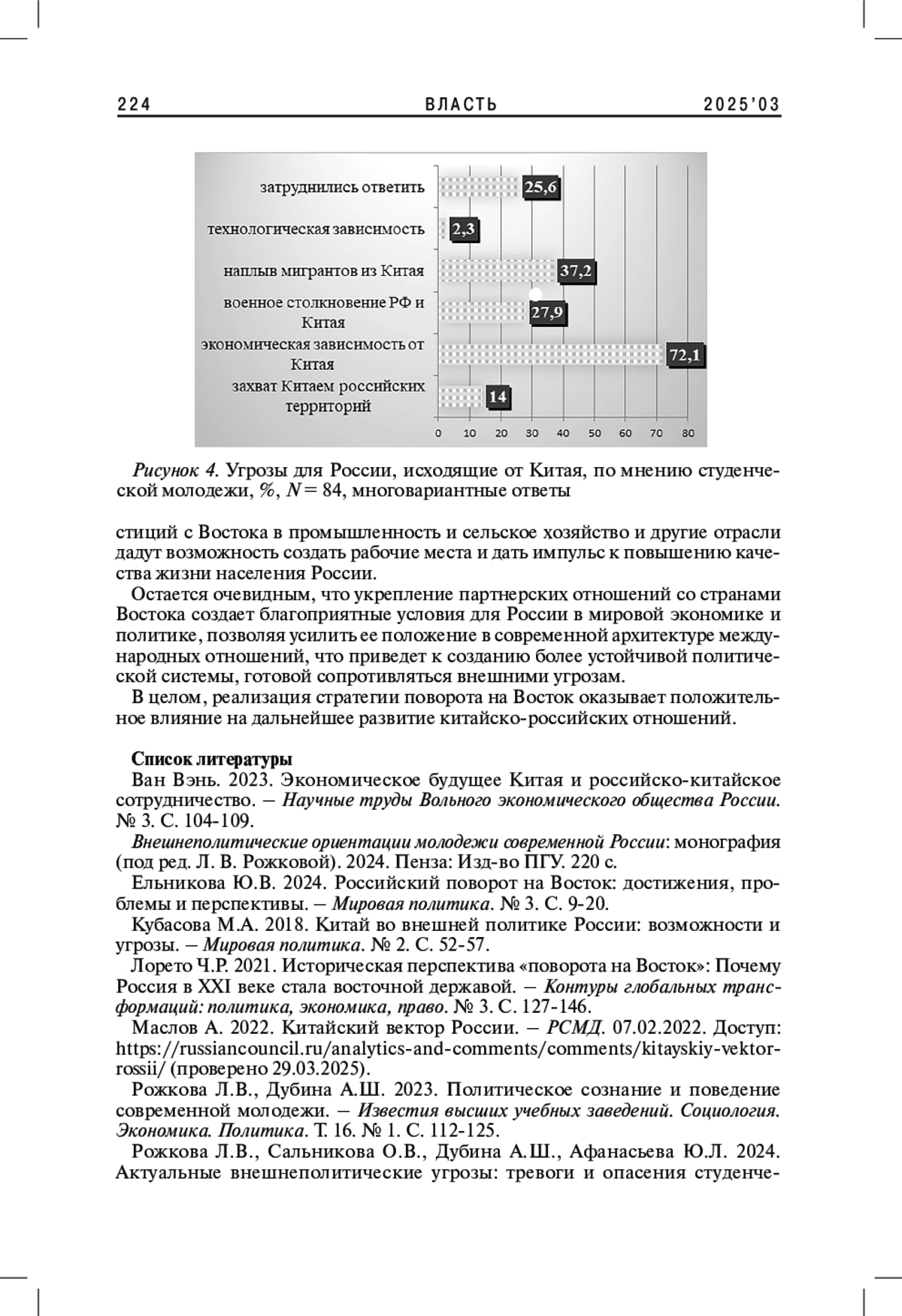 8. Рожкова Л.В., Сальникова О.В., Дубина А.Ш., Афанасьева Ю.Л. 2024. Актуальные внешнеполитические угрозы: тревоги и опасения студенческой молодежи. - Известия высших учебных заведений. Поволжский регион. Общественные науки. № 1(69). С. 42-56.