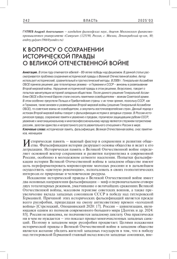 Историческая память – важный фактор в сохранении и развитии общества. Фальсификация истории разрушает основы общества и ведет к его деградации. Историческая память о Великой Отечественной войне определяет основной вектор сохранения и развития патриотизма в современной России, особенно в молодежном сегменте населения.