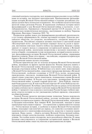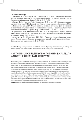 1. Бредихин А.Л., Викторов А.В., Симончук Е.Р. 2022. Сохранение исторической правды о Великой Отечественной войне как задача государства. - Экономика. Социология. Право. Т. 26. № 2. С. 70-79.