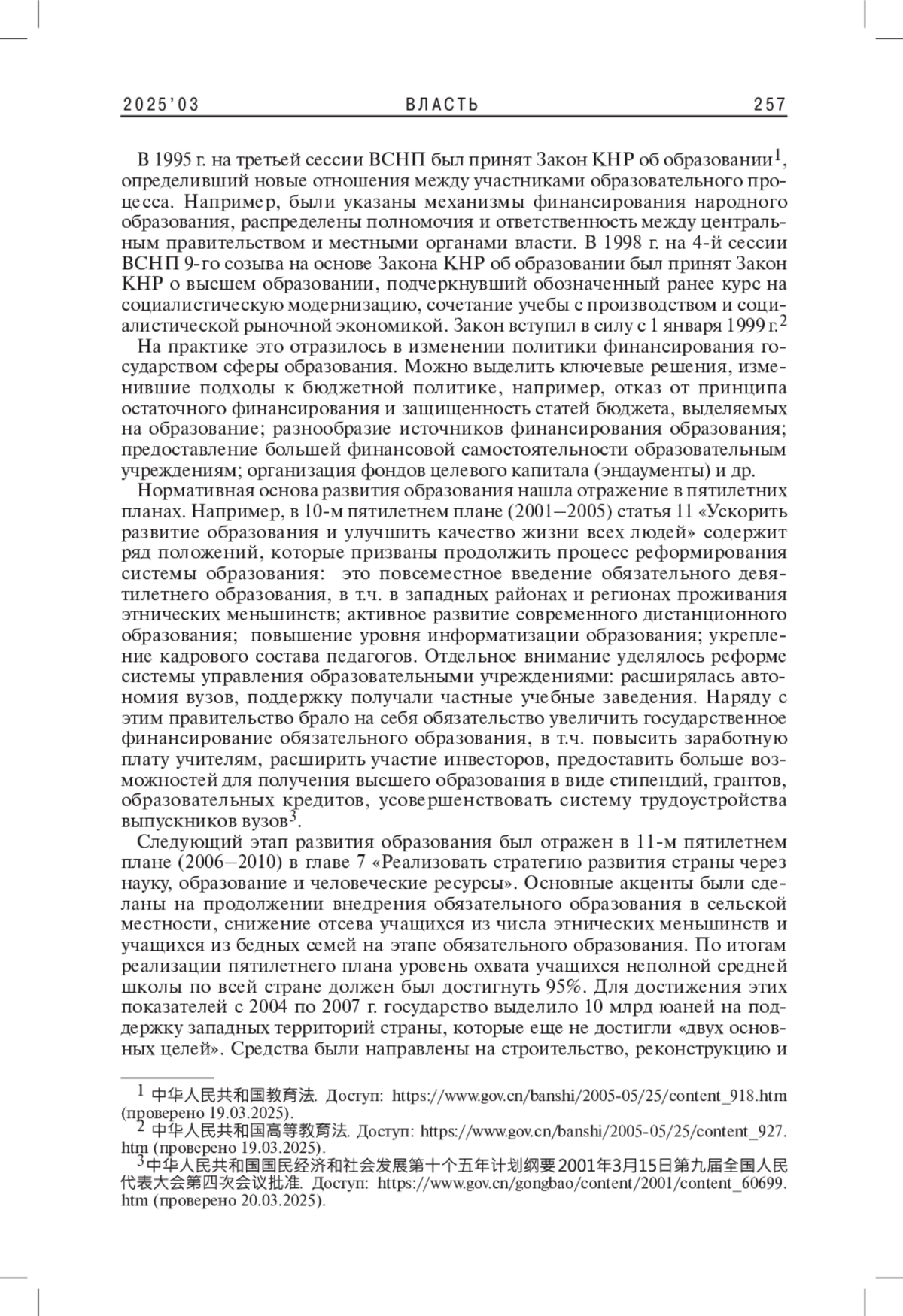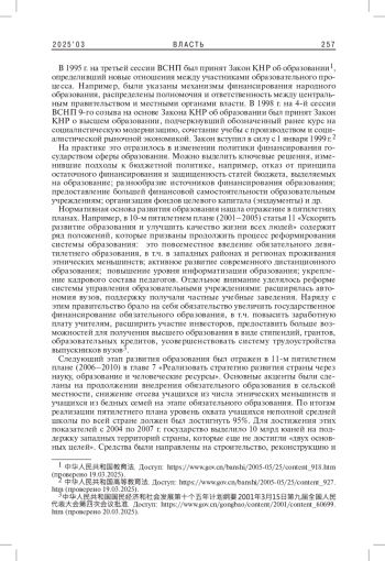 В рамках данного исследования предпринята попытка проанализировать особенности реализации государственной политики КНР в деле развития системы образования. Сфера образования занимает особое место в программе модернизации Китая, и эффективность ее функционирования рассматривается как одно из базовых условий обеспечения социально-экономического благополучия. Законы об образовании, принятые в конце 1990-х гг., определили основные рамки, в которых реализуется образовательная политика. На их основе разработан ряд специальных программ развития направлений и уровней образования. Пятилетние планы выступают как основной программный документ, который определяет целевые показатели социально-экономического развития. В рамках данной статьи изучены пятилетние планы с 2001 по 2025 г. в части развития системы образования. Выявлено, что основными задачами в указанный период были обеспечение доступности среднего образования, выравнивание региональных диспропорций в развитии образования, создание условий для образования в течение всей жизни. В программах 13-го и 14-го пятилетних планов отдельное внимание уделено расширению образовательного влияния на международном уровне; высшее образование рассматривается как особое направление внешней политики современного Китая.