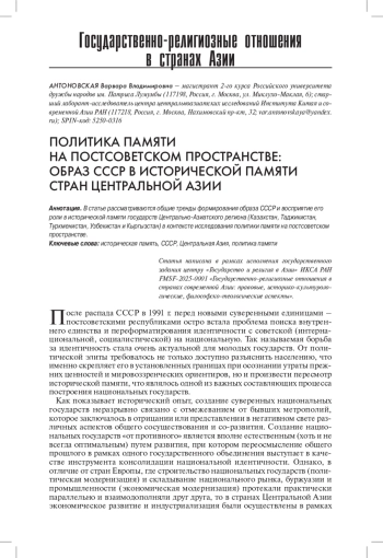 В статье рассматриваются общие тренды формирования образа СССР и восприятие его роли в исторической памяти государств Центрально-Азиатского региона (Казахстан, Таджикистан, Туркменистан, Узбекистан и Кыргызстан) в контексте исследования политики памяти на постсоветском пространстве.