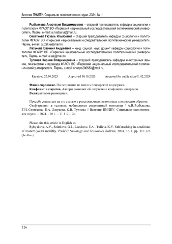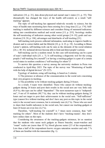 Статья базируется на результатах социологического исследования студенческой молодежи в городе-миллионере и раскрывает специфику социологического исследования селф-трекинга, связанную прежде всего с изучением отношений между врачом, рекомендующим селф-трекинг, и пациентом, использующим его, а также с компаративным анализом различных социальных групп, являющихся потребителем данной технологии. Статья посвящена особенностям самомониторинга молодежи с помощью цифровых устройств, которые раскрываются на основе эмпирического исследования, проведенного авторами в 2023 г. среди студентов вузов г. Перми. В качестве методологии исследования выбрана теория мобильности Дж. Урри. Одной из задач исследования был поиск ответа на вопрос: является ли селф-трекинг для молодого поколения средством диагностики состояния своего здоровья («селф-трекинг для себя»), или потребление трекинг-гаджетов в современных условиях становится показателем определенного социального статуса («селф-трекинг для других»)? Авторы склоняются к первому тезису. В результате исследования была сконструирована собственная типология студентов по селф-трекингу: «зависимые», «независимые», «самодостаточные» и «умеренные», выявлена распространенность представленных типов. Доминирующим становится достаточно благоприятный тип «независимые», характеризующийся отсутствием болезненной привязанности к трекинг-гаджетам и не нацеленный на публичное представление в социальных сетях своих зафиксированных данных. Согласно результатам исследования, на регулярность отслеживания состояния своего здоровья влияет характер перемещений студентов по городу. Были выявлены наиболее распространенные устройства для трекинга среди городской молодежи. Из широкого перечня таких устройств студентам известны в основном фитнес-браслеты, смарт-часы, что также отражает повышенный интерес к характеру мобильности молодежи.