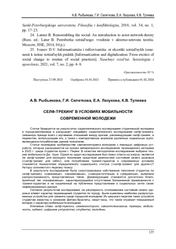 1. Богомягкова Е.С., Дупак А.А. Цифровой селф-трекинг здоровья в дискурсе социальных наук // Социология науки и технологий. - 2021. - № 2. - С. 155-174. EDN: EAHKTO