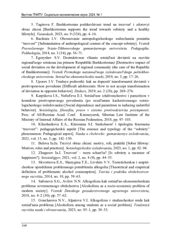 10. Клюшникова Е.А., Хромина С.И. Сущность и типология феномена “трезвость”: педагогический аспект // Наука о человеке: гуманитарные исследования. - 2021. - Т. 15, № 3. - С. 142-150. EDN: HICCRG