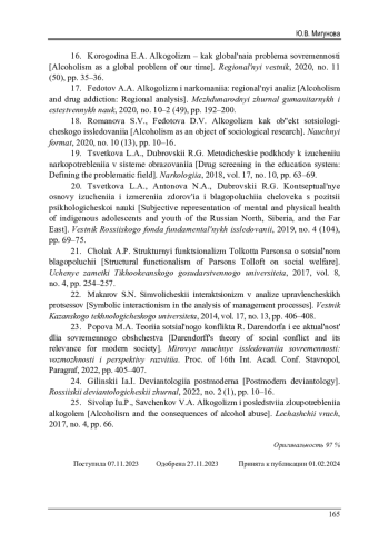 18. Романова С.В., Федотова Д.В. Алкоголизм как объект социологического исследования // Научный формат. - 2020. - № 10 (13). - С. 10-16. EDN: IKUOHU