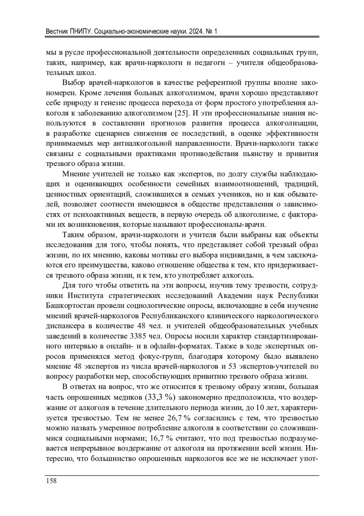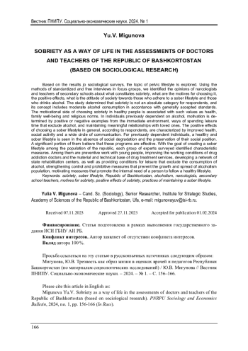 На основе результатов социологических опросов исследуется тема трезвого образа жизни. Методами стандартизированного и свободного интервью в фокус-группах было выявлено мнение врачей-наркологов и учителей общеобразовательных школ о том, что представляет собой трезвость, каковы мотивы ее выбора, положительные эффекты, каково отношение общества к тем, кто придерживается трезвого образа жизни и к тем, кто употребляет алкоголь. В ходе исследования определено, что трезвость не является для респондентов абсолютной категорией, и в ее понятие включается умеренное потребление алкоголя в соответствии с общепринятыми нормами. Мотивационная сторона выбора трезвости у здоровых людей связана с такими ценностями, как здоровье, семейное благополучие и религиозные нормы. У ранее зависимых от алкоголя лиц мотивация определяется позитивными или негативными примерами из ближнего окружения, способами проведения досуга, исключающими спиртное, и сохранением значимых отношений с близкими. Положительные эффекты выбора трезвого образа жизни в целом, по мнению респондентов, характеризуются укреплением здоровья, социальной активностью и широким кругом общения. У ранее зависимых лиц здоровый и трезвый образ жизни видится в отсутствии социальной деградации и сохранении своего социального положения. Значительная часть из них считает, что эти программы результативны. С целью формирования среди населения республики трезвого образа жизни каждая группа опрошенных экспертов выделила характерные меры. Среди них - профилактическая работа с молодежью, улучшение условий труда врачей-наркологов и материально-технической базы наркологических служб, развитие сети государственных реабилитационных центров, а также предоставление условий для досуга, исключающего потребление спиртного, усиление контролирующих и запретительных мер, препятствующих росту и распространению алкоголизации населения, мотивирующие меры, способствующие внутренней потребности человека к следованию здоровому образу жизни.