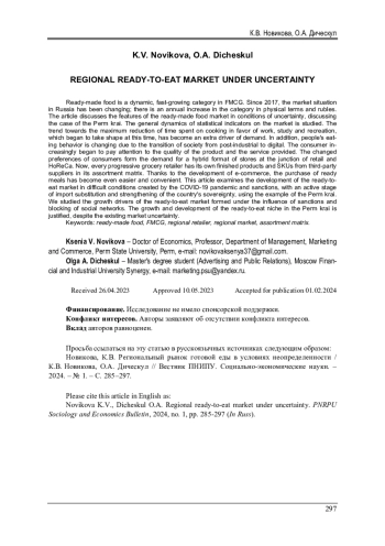 НОВИКОВА К. В., ДИЧЕСКУЛ О. А. РЕГИОНАЛЬНЫЙ РЫНОК ГОТОВОЙ ЕДЫ В УСЛОВИЯХ НЕОПРЕДЕЛЕННОСТИ // ВЕСТНИК ПЕРМСКОГО НАЦИОНАЛЬНОГО ИССЛЕДОВАТЕЛЬСКОГО ПОЛИТЕХНИЧЕСКОГО УНИВЕРСИТЕТА. СОЦИАЛЬНО-ЭКОНОМИЧЕСКИЕ НАУКИ. 2024. № 1