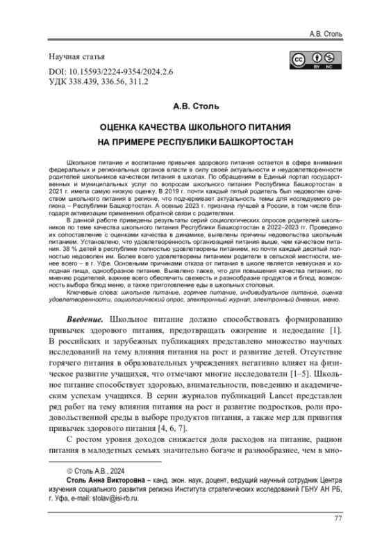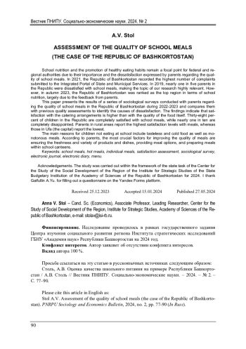 СТОЛЬ А. В. ОЦЕНКА КАЧЕСТВА ШКОЛЬНОГО ПИТАНИЯ НА ПРИМЕРЕ РЕСПУБЛИКИ БАШКОРТОСТАН // ВЕСТНИК ПЕРМСКОГО НАЦИОНАЛЬНОГО ИССЛЕДОВАТЕЛЬСКОГО ПОЛИТЕХНИЧЕСКОГО УНИВЕРСИТЕТА. СОЦИАЛЬНО-ЭКОНОМИЧЕСКИЕ НАУКИ. 2024. № 2
