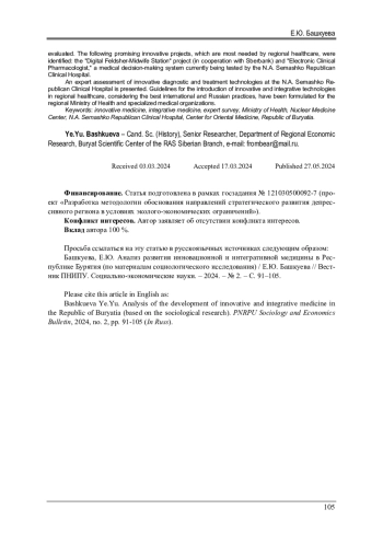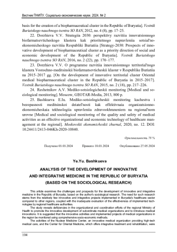 Статья: АНАЛИЗ РАЗВИТИЯ ИННОВАЦИОННОЙ И ИНТЕГРАТИВНОЙ МЕДИЦИНЫ В РЕСПУБЛИКЕ БУРЯТИЯ (ПО МАТЕРИАЛАМ СОЦИОЛОГИЧЕСКОГО ИССЛЕДОВАНИЯ) (2024)
