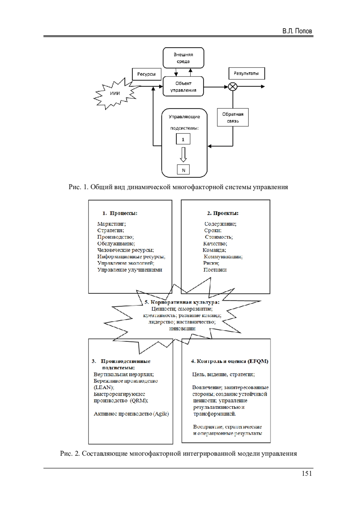Моделирование деятельности организации способствует обеспечению ее долгосрочных конкурентных преимуществ. Наиболее распространенными являются модели по видам деятельности: стратегия, структуры, процессы, проекты, изменения. Развитие моделей идет в направлении комбинаторики и увеличения количества учитываемых факторов. Интегрированные модели позволяют обеспечить комплексный (экосистемный) подход к управлению организацией. В рамках данной статьи обоснована логика формирования многофакторной интегрированной модели управления организации, учитывающей достижения в области управления изменениями, управления процессами, управления стратегией, управления проектами, управление технологиями, управления инновациями. Учтены тренды, зафиксированные в концепции «Менеджмент 2.0». В качестве основного фактора успешности применения данной модели является развитая корпоративная культура организации. Процессный подход к управлению предполагает использование модифицированного Перечня процессов международной бенчмаркинговой палаты. Проектный подход предполагает использование традиционного каскадного управления. В модели заложено несколько вариантов производственных концепций, включая LEAN, QRM, Agile. Соответствующая корпоративная культура организации предполагает развитие лидерства, команд, креативности, наставничества. В основе каждого конкретного шага по развитию лежит Инициирующий импульс изменений. Основная задача корпоративной культуры с позиции устойчивого развития организации является обеспечение непрерывного потока Инициирующих импульсов изменений, их оценка и реализация. Оценка прогресса в развитии организации осуществляется в рамках интегрированной модели на основе подхода EFQM-2020 по схеме «целеполагание - действия - результаты». Применимость разработанной многофакторной интегрированной модели управления продемонстрирована на примере процессно-ориентированной компании ПАО «ПНППК». В компании используются современные методологии и системы управления, в том числе QRM, LEAN; функционирует корпоративная информационная система управления от уровня стратегического управления компанией до операционного цехового уровня. На основе модели показано, что, несмотря на высокие экономические достижения, в компании имеются существенные резервы по повышению эффективности ее деятельности.
