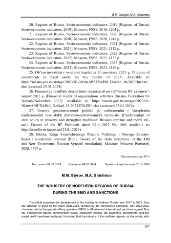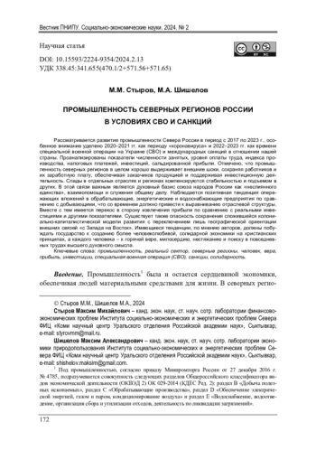 Рассматривается развитие промышленности Севера России в период с 2017 по 2023 г., особенное внимание уделено 2020-2021 гг. как периоду «коронавируса» и 2022-2023 гг. как времени специальной военной операции на Украине (СВО) и международных санкций в отношении нашей страны. Проанализированы показатели численности занятых, уровня оплаты труда, индекса производства, налоговых платежей, инвестиций, сальдированной прибыли. Отмечено, что промышленность северных регионов в целом хорошо выдерживает внешние шоки, сохраняя работников и их заработную плату, обеспечивая заказчиков продукцией и поддерживая инвестиционную деятельность. Спады в отдельных отраслях и регионах компенсируются стабильностью и подъемом в других. В этой связи важным является духовный базис союза народов России как «неслиянного единства», взаимопомощи и служения общему делу. Наблюдается позитивная тенденция опережающих вложений в обрабатывающие, энергетические и водоснабжающие предприятия по сравнению с добывающими, что со временем должно привести к выравниванию отраслевой структуры. Вместе с тем имеется перекос в сторону извлечения прибыли по сравнению с реальными инвестициями и другими показателями. Существует также опасность сохранения сложившейся колониально-капиталистической модели развития с переключением лишь географической ориентации внешних связей «с Запада на Восток». Имеющиеся тенденции, по мнению авторов, должны побуждать государство к созданию более человеколюбивой, солидарной экономики на христианских принципах, а каждого человека - к горячей вере, милосердию, нестяжанию и поиску в повседневных трудах высшего духовного смысла.