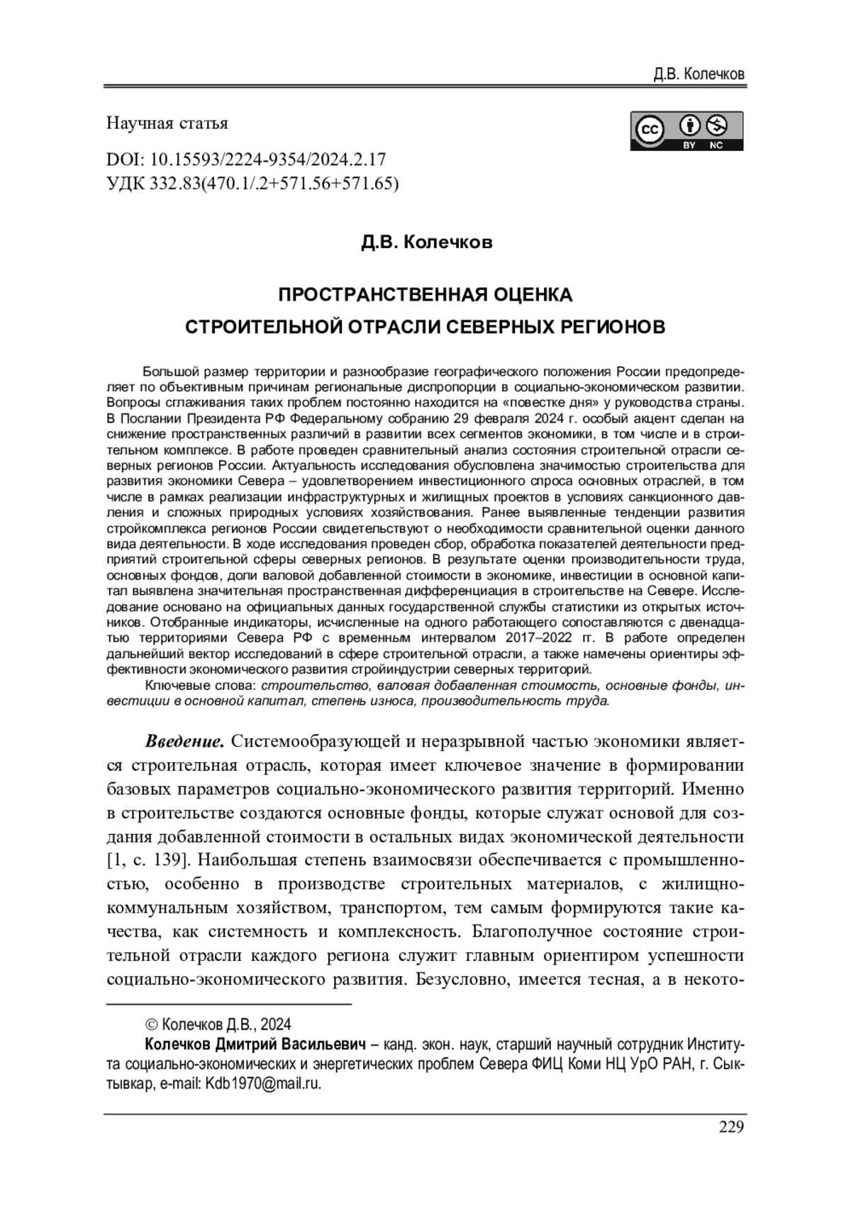 Большой размер территории и разнообразие географического положения России предопределяет по объективным причинам региональные диспропорции в социально-экономическом развитии. Вопросы сглаживания таких проблем постоянно находится на «повестке дня» у руководства страны. В Послании Президента РФ Федеральному собранию 29 февраля 2024 г. особый акцент сделан на снижение пространственных различий в развитии всех сегментов экономики, в том числе и в строительном комплексе. В работе проведен сравнительный анализ состояния строительной отрасли северных регионов России. Актуальность исследования обусловлена значимостью строительства для развития экономики Севера - удовлетворением инвестиционного спроса основных отраслей, в том числе в рамках реализации инфраструктурных и жилищных проектов в условиях санкционного давления и сложных природных условиях хозяйствования. Ранее выявленные тенденции развития стройкомплекса регионов России свидетельствуют о необходимости сравнительной оценки данного вида деятельности. В ходе исследования проведен сбор, обработка показателей деятельности предприятий строительной сферы северных регионов. В результате оценки производительности труда, основных фондов, доли валовой добавленной стоимости в экономике, инвестиции в основной капитал выявлена значительная пространственная дифференциация в строительстве на Севере. Исследование основано на официальных данных государственной службы статистики из открытых источников. Отобранные индикаторы, исчисленные на одного работающего сопоставляются с двенадцатью территориями Севера РФ с временн ы м интервалом 2017-2022 гг. В работе определен дальнейший вектор исследований в сфере строительной отрасли, а также намечены ориентиры эффективности экономического развития стройиндустрии северных территорий.