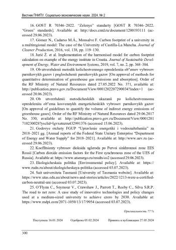 ФИЛИМОНОВА И. В., САВИНА А. И., КРИВОШЕЕВА О. И., ГЛАДКИХ К. Д. УГЛЕРОДНЫЙ СЛЕД УНИВЕРСИТЕТА КАК ИНСТРУМЕНТ ПОВЫШЕНИЯ КЛИМАТИЧЕСКОЙ ГРАМОТНОСТИ СТУДЕНТОВ // ВЕСТНИК ПЕРМСКОГО НАЦИОНАЛЬНОГО ИССЛЕДОВАТЕЛЬСКОГО ПОЛИТЕХНИЧЕСКОГО УНИВЕРСИТЕТА. СОЦИАЛЬНО-ЭКОНОМИЧЕСКИЕ НАУКИ. 2024. № 2