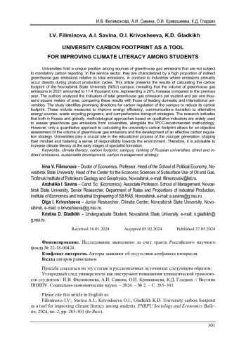 Статья: УГЛЕРОДНЫЙ СЛЕД УНИВЕРСИТЕТА КАК ИНСТРУМЕНТ ПОВЫШЕНИЯ КЛИМАТИЧЕСКОЙ ГРАМОТНОСТИ СТУДЕНТОВ (2024)