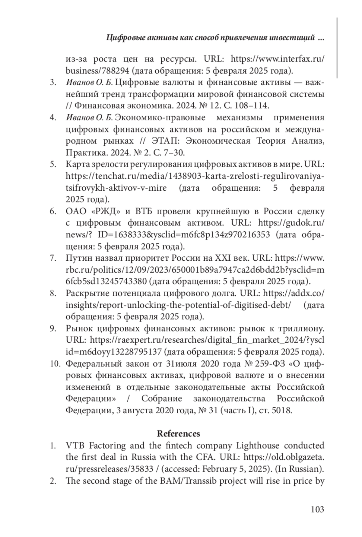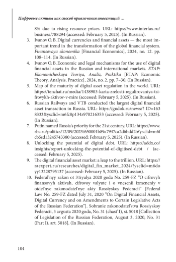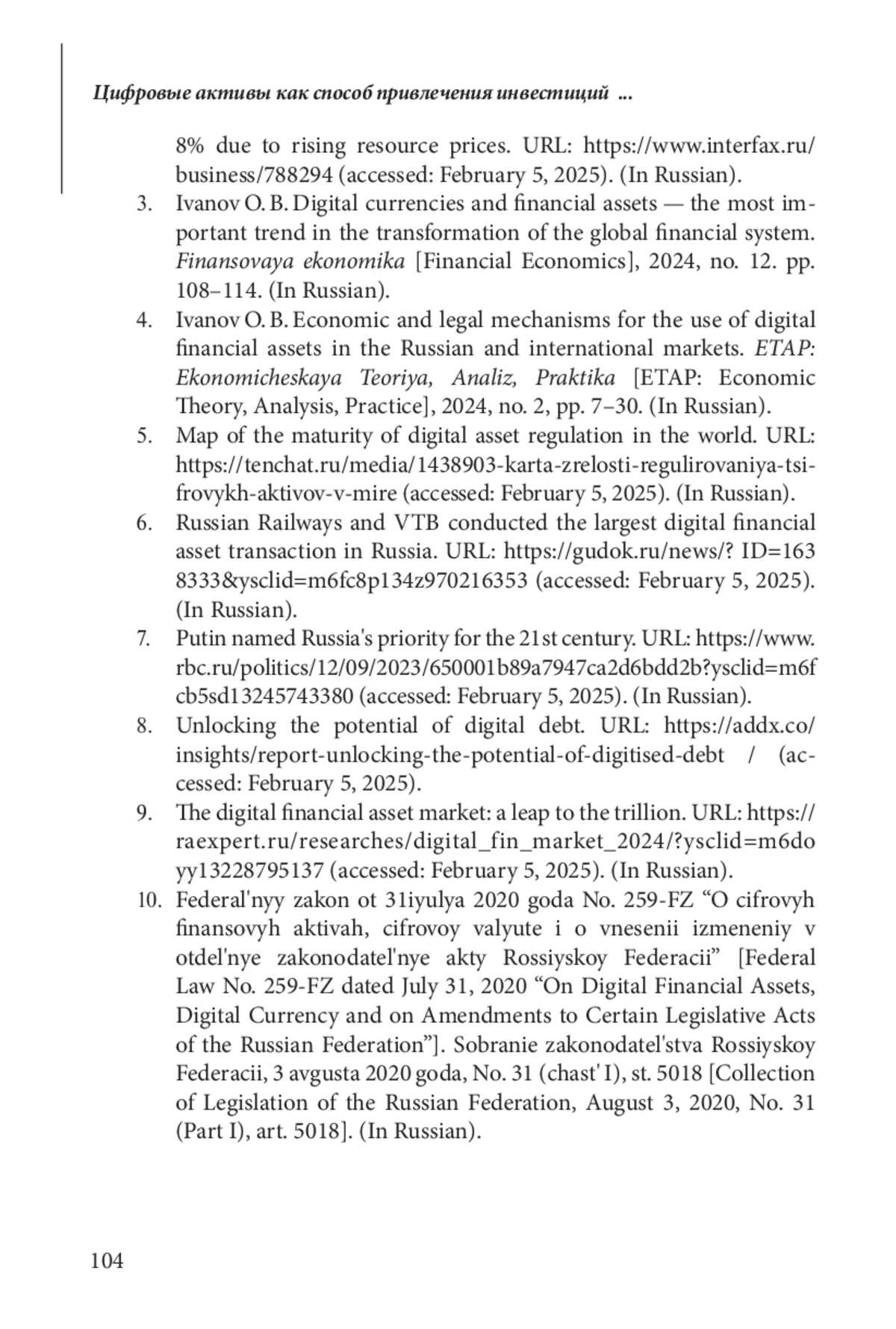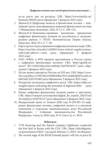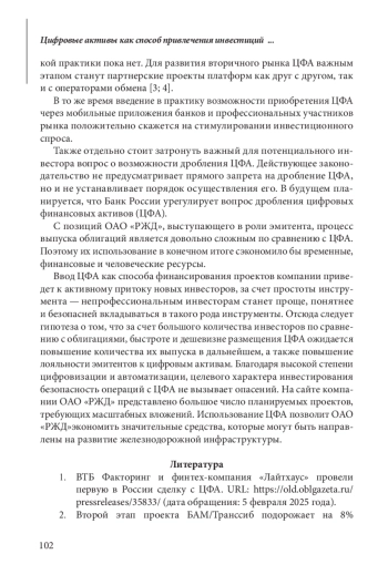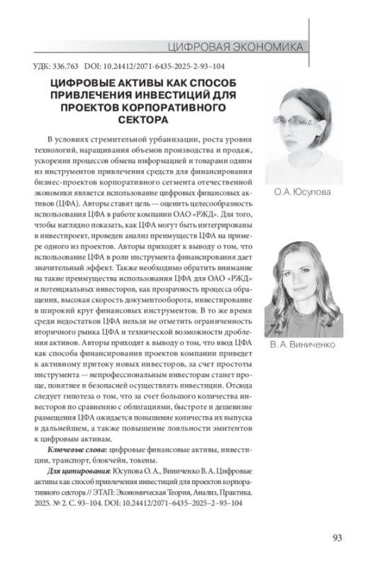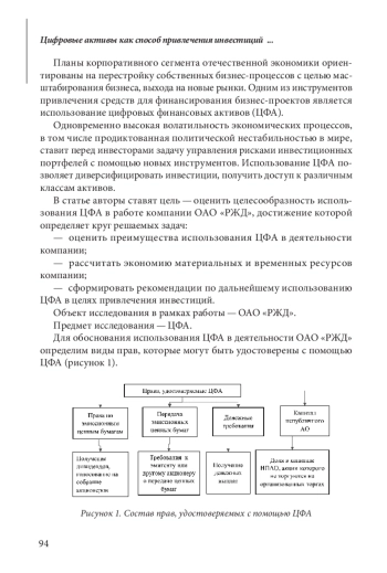В условиях стремительной урбанизации, роста уровня технологий, наращивания объемов производства и продаж, ускорения процессов обмена информацией и товарами одним из инструментов привлечения средств для финансирования бизнес-проектов корпоративного сегмента отечественной экономики является использование цифровых финансовых активов (ЦФА). Авторы ставят цель — оценить целесообразность использования ЦФА в работе компании ОАО «РЖД». Для того, чтобы наглядно показать, как ЦФА могут быть интегрированы в инвестпроект, проведен анализ преимуществ ЦФА на примере одного из проектов. Авторы приходят к выводу о том, что использование ЦФА в роли инструмента финансирования дает значительный эффект. Также необходимо обратить внимание на такие преимущества использования ЦФА для ОАО «РЖД» и потенциальных инвесторов, как прозрачность процесса обращения, высокая скорость документооборота, инвестирование в широкий круг финансовых инструментов. В то же время среди недостатков ЦФА нельзя не отметить ограниченность вторичного рынка ЦФА и технической возможности дробления активов. Авторы приходят к выводу о том, что ввод ЦФА как способа финансирования проектов компании приведет к активному притоку новых инвесторов, за счет простоты инструмента — непрофессиональным инвесторам станет проще, понятнее и безопасней осуществлять инвестиции. Отсюда следует гипотеза о том, что за счет большого количества инвесторов по сравнению с облигациями, быстроте и дешевизне размещения ЦФА ожидается повышение количества их выпуска в дальнейшем, а также повышение лояльности эмитентов к цифровым активам.