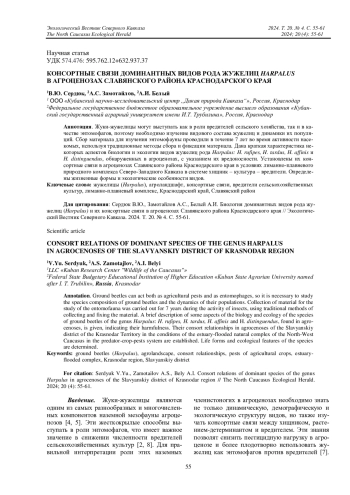 7. Сердюк В.Ю., Замотайлов А.С., Бондаренко А.С. Жизненные формы, экологическая приуроченность и ареалогическая характеристика жужелиц (Coleoptera, Carabidae) агроландшафта в условиях лиманно-плавневого природного комплекса северо-Западного Кавказа // Труды Кубанского государственного аграрного университета. 2019. Вып. 1 (76). С. 147-154. DOI: 10.21515/1999-1703-76-147-154 EDN: RSVVZG