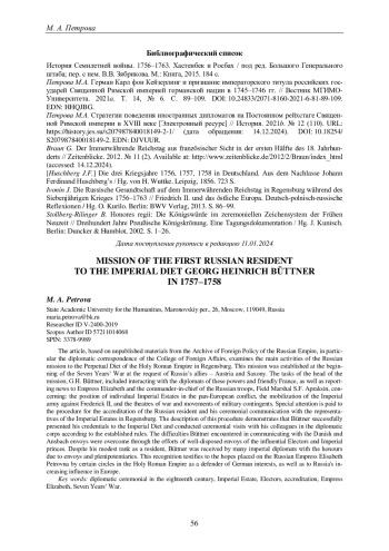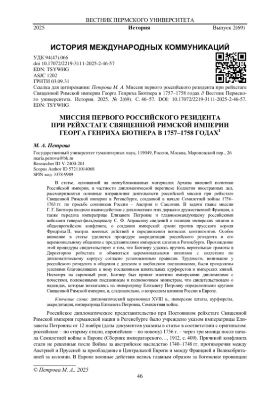 ПЕТРОВА М. А. МИССИЯ ПЕРВОГО РОССИЙСКОГО РЕЗИДЕНТА ПРИ РЕЙХСТАГЕ СВЯЩЕННОЙ РИМСКОЙ ИМПЕРИИ ГЕОРГА ГЕНРИХА БЮТНЕРА В 1757-1758 ГОДАХ // ВЕСТНИК ПЕРМСКОГО УНИВЕРСИТЕТА. ИСТОРИЯ. 2025. № 2 (69)