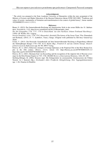 Статья: МИССИЯ ПЕРВОГО РОССИЙСКОГО РЕЗИДЕНТА ПРИ РЕЙХСТАГЕ СВЯЩЕННОЙ РИМСКОЙ ИМПЕРИИ ГЕОРГА ГЕНРИХА БЮТНЕРА В 1757-1758 ГОДАХ (2025)