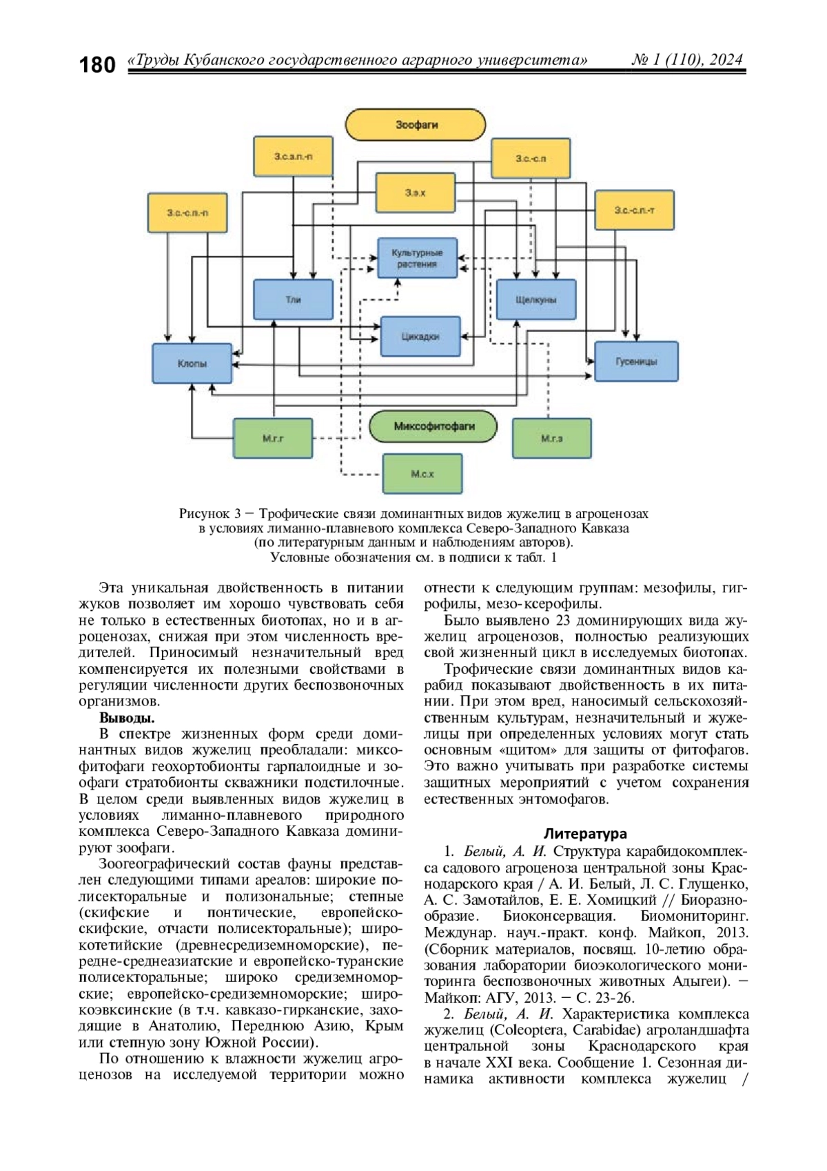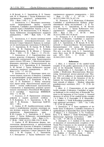 Целью настоящей работы являлось определение особенностей формирования трофических связей и пищевой специализации доминантных видов жужелиц агроценозов Славянского и части Темрюкского районов Краснодарского края, а также выявление основных повреждаемых культур и мест их локализации. Установлено, что среди массовых видов встречаются как зоофаги, так и миксофитофаги. Карабидокомплекс агроценозов лиманно-плавневой территории представлен 23 доминирующими видами, полностью реализующими свой жизненный цикл в исследуемых биотопах: Carabus cumanus, C. campestris, C. exaratus, Poecilus cupreus, Pterostichus niger, Сalathus distinguendus, C. fuscipes, C. erratus, C. melanocephalus, C. halensis, Amara aenea, A. lucida, Zabrus tenebrioides, Harpalus rufipes, H. tardus, H. affinis, H. distinguendus, Ophonus azureus, Callistus lunatus, Dinodes decipiens, Chlaenius aeneocephalus, Ch. nitidulus, Brachinus crepitans. Преобладали миксофитофаги геохортобионты гарпалоидные и зоофаги стратобионты скважники подстилочные. Тем не менее, из общего количества выявленных видов жужелиц доминируют зоофаги. Среди обнаруженных доминантных видов в агроценозах встречаются вредители сельскохозяйственных культур, требующие разработки защитных мероприятий. Зоогеографический анализ выявил широкие полисекторальные и полизональные, степные, европейско-скифские, широкотетийские, передне-среднеазиатские, европейско-туранские полисекторальные, широкосредиземноморские, европейско-средиземноморские и широкоэвксинские ареалы. По отношению к влажности карабидокомплекс представлен мезофилами, мезо-ксерофилами, гигрофилами.
