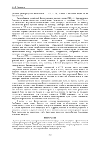 До революции для многих финно-пермских народов были разработаны алфавиты на основе кириллицы. Продолжался этот процесс и при советской власти. Однако уже в 1920-х гг. возникли первые идеи о латинизации письменности этих народов. Триггером для данной активности стало внедрение в 1920-х гг. в разных регионах СССР латинизированных алфавитов для народов, пользовавшихся «сложной» письменностью (в первую очередь арабской). Ввиду того что финно-пермские народы СССР использовали русский алфавит, который не имеет принципиальных отличий от латинского, «латинизаторы» выдвинули для своих идей политические обоснования. В 1930 г. деятельность по латинизации письменности финно- пермских народов СССР вступила в активную фазу. На первых порах местные власти большинства финно-пермских регионов не решались открыто противостоять деятельности «латинизаторов». Т ем н е м енее в э тих р егионах б ыли о тмечены н е т олько прохладное отношение к латинизации со стороны властей и части интеллигенции, но и сопротивление ей, главными причинами чего были, во-первых, наличие уже существовавших и применявшихся алфавитов на кириллической основе, во-вторых, сохранение важной роли русского языка. Ударом по латинизации стало изменение политической ситуации на уровне всей страны, в том числе в 1930 г. была запрещена латинизация русской письменности. После этого в большинстве финно-пермских регионов власти отринули латинизацию. Во всех регионах прослеживались схожие тенденции, за исключением Карелии, где родной язык на официальном уровне не использовался, и лишь в 1937-1939 гг. на короткое время был введен в оборот.