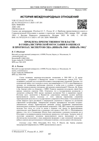 Статья посвящена американо-югославским отношениям в 1969-1980 гг. В центре исследования - восприятие в Вашингтоне личных и политических качеств И. Б. Тито, оставившего глубокий след в истории Югославии и международных отношений. Показано, что политический выбор этого политика в пользу дистанцирования от СССР и стран Варшавского договора, его независимая внеблоковая стратегия и особая роль в создании и развитии Движения неприсоединения учитывались при решении администраций Р. Никсона, Дж. Форда и Дж. Картера пойти на сближение с СФРЮ. Развитие американо-югославских связей было важным элементом стратегии США. Отмечается, что в государственном руководстве и экспертном сообществе США высоко оценивали достижения Тито в управлении страной. В течение всего десятилетия в Вашингтоне существенное внимание уделяли проблеме преемственности власти, поскольку от этого зависели перспективы сохранения территориальной целостности и государственного суверенитета Югославии. Статья написана на основе широкого круга российских и американских документов и опирается на достижения современной историографии. Эмпирический материал препарируется методами историко- динамического анализа. Первоочередное внимание уделено оцениванию американскими аналитическими службами (Государственный департамент, СНБ, ЦРУ) перспектив сохранения наследия Тито после его ухода из жизни и влиянию этих оценок на формулирование стратегических задач Вашингтона в отношении этой страны в 1969-1981 гг. Обосновываются выводы о том, что в Соединенных Штатах были осведомлены о реальном положении дел в Югославии и отслеживали развитие политических процессов в этой стране. Эксперты знали об отсутствии адекватного механизма преемственности власти, вытекающих из этого обстоятельства последствиях в виде разрушения федерации и даже возможной гражданской войны и строили свою региональную и глобальную политику с учетом данного обстоятельства.