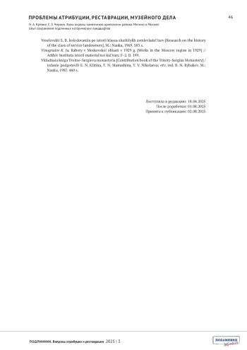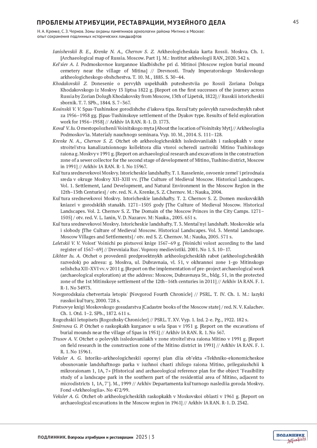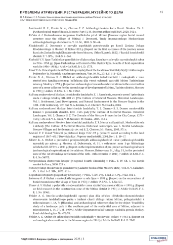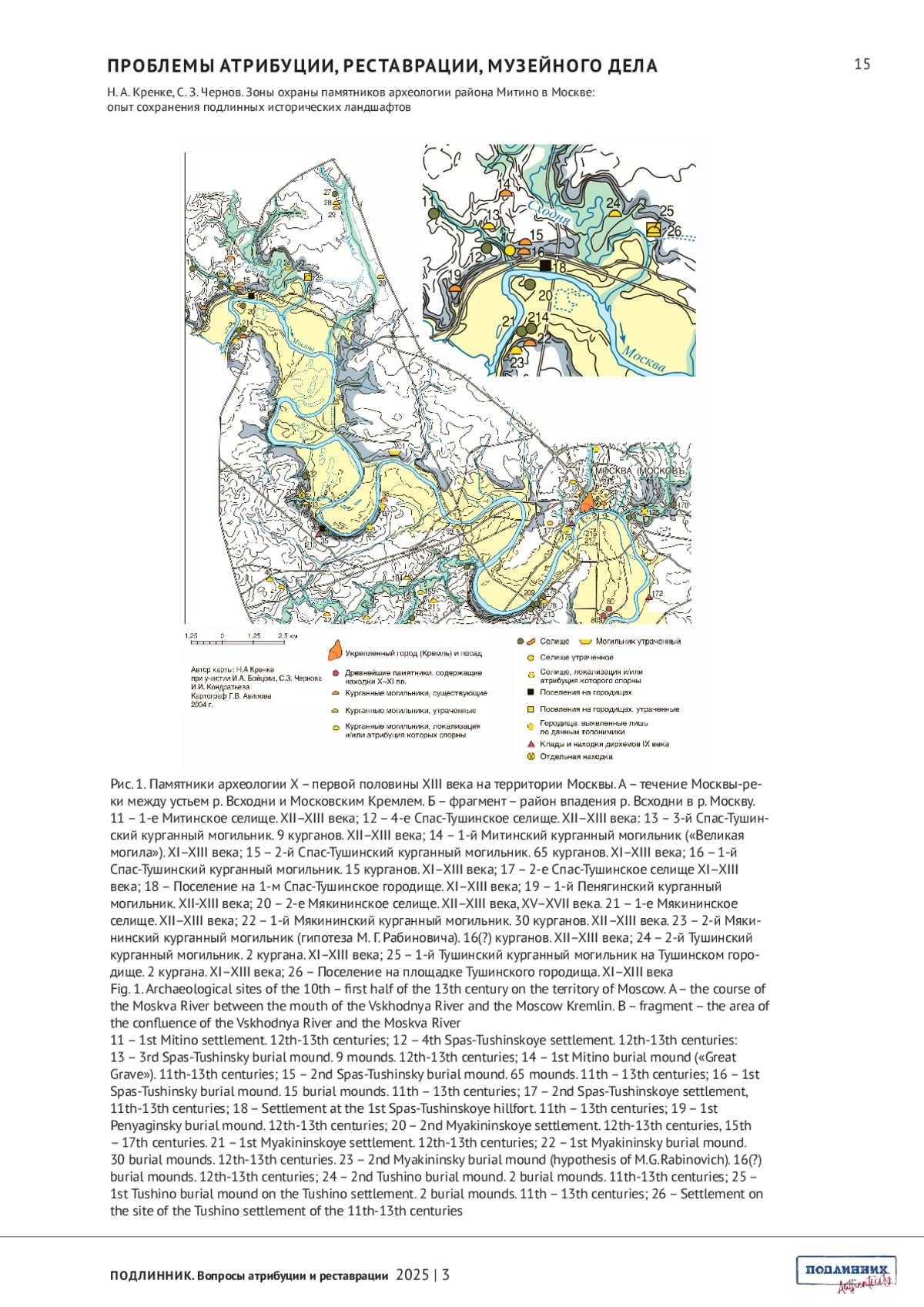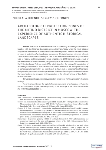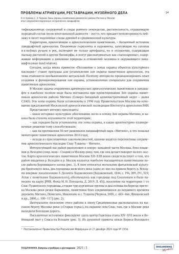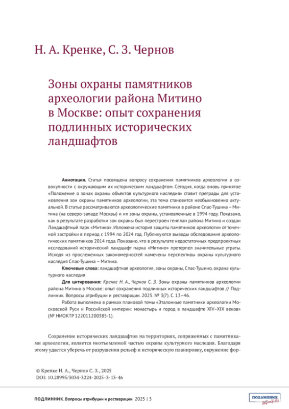 КРЕНКЕ Н. А., ЧЕРНОВ С. З. ЗОНЫ ОХРАНЫ ПАМЯТНИКОВ АРХЕОЛОГИИ РАЙОНА МИТИНО В МОСКВЕ: ОПЫТ СОХРАНЕНИЯ ПОДЛИННЫХ ИСТОРИЧЕСКИХ ЛАНДШАФТОВ // ПОДЛИННИК. ВОПРОСЫ АТРИБУЦИИ И РЕСТАВРАЦИИ. 2025. № 3 (7)
