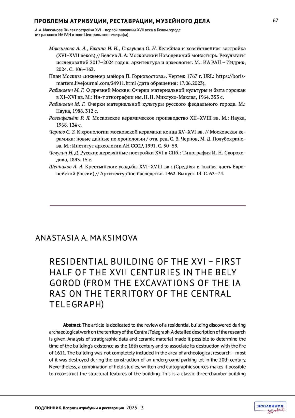 1. Беляев Л. А. Максимова А. А. Новодевичий монастырь: центральная зона застройки XVI-XVII вв. (по материалам раскопа 2020 года) // Краткие сообщения Института Археологии. 2023. № 272. С. 134-155.