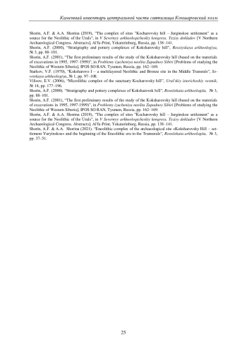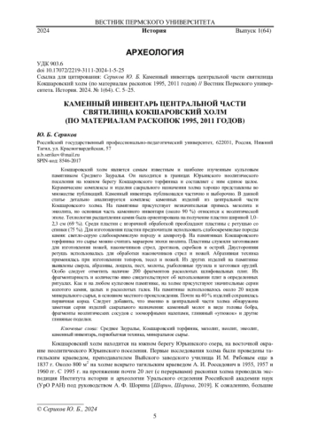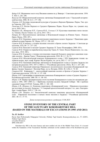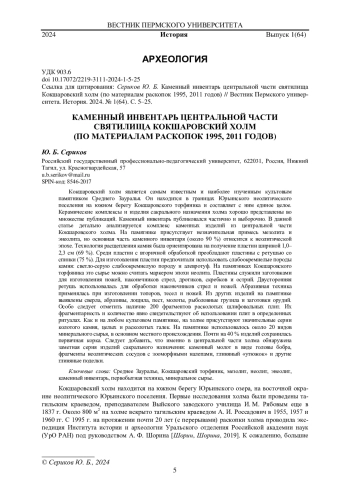 СЕРИКОВ Ю. Б. КАМЕННЫЙ ИНВЕНТАРЬ ЦЕНТРАЛЬНОЙ ЧАСТИ СВЯТИЛИЩА КОКШАРОВСКИЙ ХОЛМ (ПО МАТЕРИАЛАМ РАСКОПОК 1995, 2011 ГОДОВ) // ВЕСТНИК ПЕРМСКОГО УНИВЕРСИТЕТА. ИСТОРИЯ. 2024. № 1 (64)