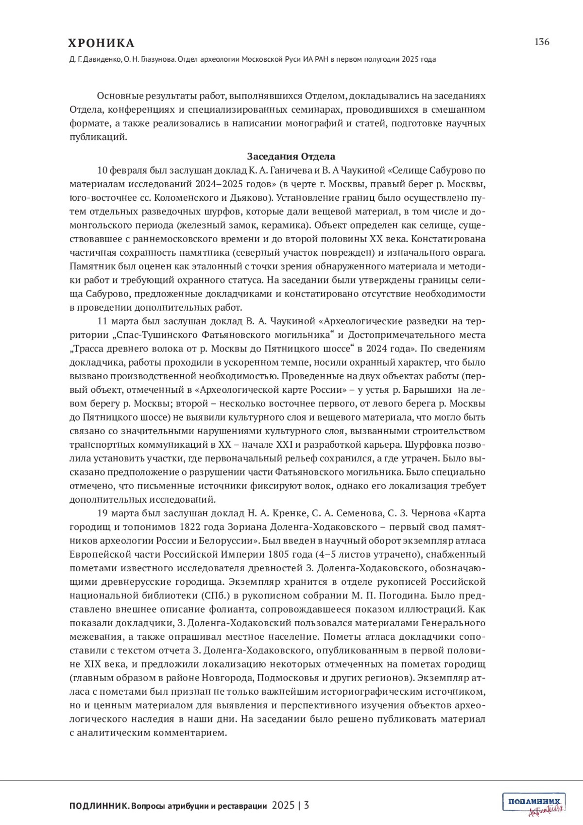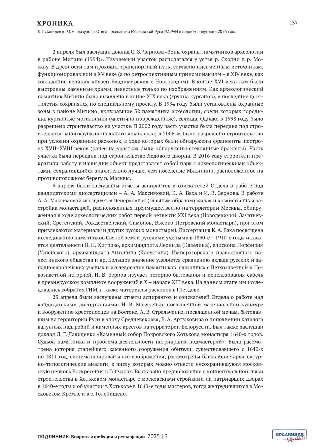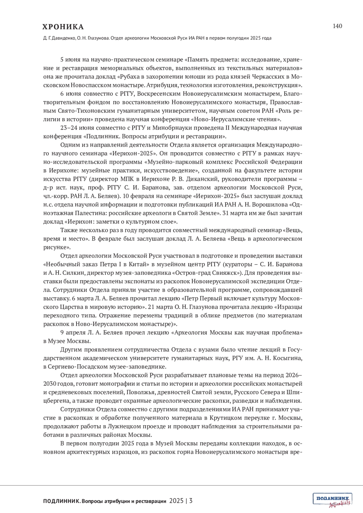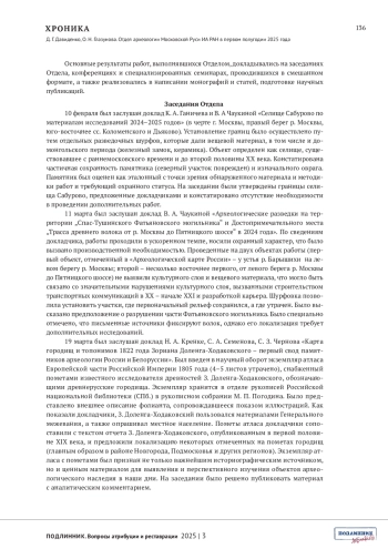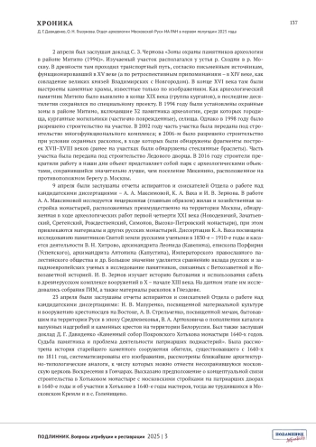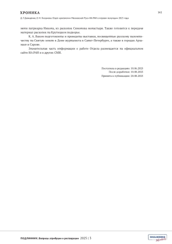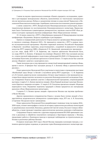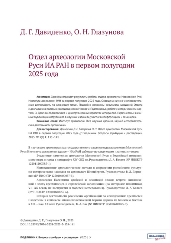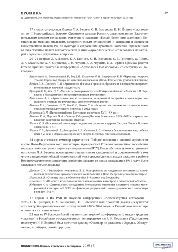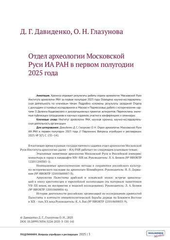 ДАВИДЕНКО Д.Г., ГЛАЗУНОВА О.Н. ОТДЕЛ АРХЕОЛОГИИ МОСКОВСКОЙ РУСИ ИА РАН В ПЕРВОМ ПОЛУГОДИИ 2025 ГОДА // ПОДЛИННИК. ВОПРОСЫ АТРИБУЦИИ И РЕСТАВРАЦИИ. 2025. № 3 (7)