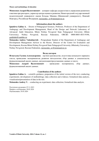Обсуждения и заключения. Степень новизны результатов исследования определяется авторами в двух взаимосвязанных аспектах. Принципиальная новизна представлена совокупностью положений и идей в предложенном универсальном механизме формирования полипозиционной команды в контексте теории самообучающейся организации и обоснованием закономерности о связи содержания проектного типа при построении событийных встреч и новых форматов непрерывного опережающего образования взрослых, которые квалифицируются как решение научной проблемы проектирования стратегий и программ развития университета проектно-программного характера. Новизна на уровне конкретизации и уточнения результатов представлена организацией проектного эксперимента и методологией оценки эффективности разработанных условий формирования полипозиционной команды непрерывного опережающего педагогического образования, воплощение которых повышает продуктивность научного исследования и его практическую и социокультурную значимость.