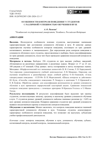 Введение. Исследуются особенности психики студентов, выступающие значимыми характеристиками при достижении успешности обучения в вузе. В качестве данных характеристик изучены особенности контроля поведения, состоящего из трех уровней: когнитивного, волевого и эмоционального. Для определения роли контроля поведения в успешности обучения в вузе студенты, представленные в выборке, были классифицированы по трем уровням успешности, после чего было проведено сравнение показателей контроля их поведения.